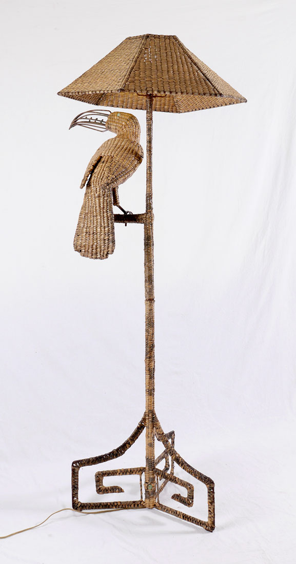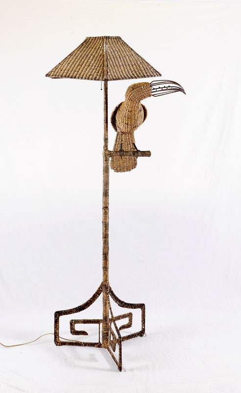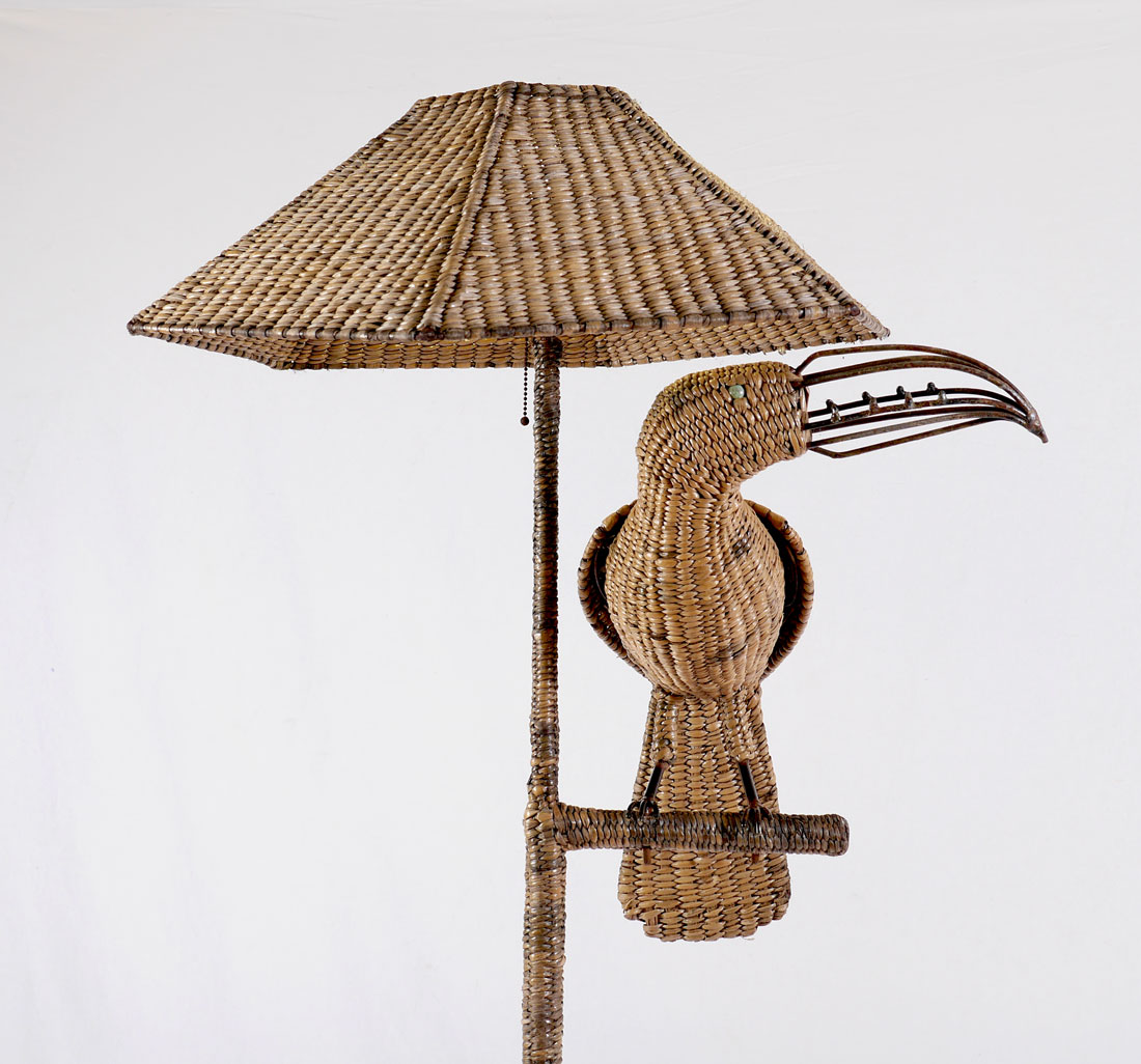 MARIO LOPEZ TORRES VINTAGE WOVEN TOUCAN LAMP: Vintage woven reed or wicker floor lamp featuring a figural toucan with metal beak, woven shade, three legged base, Mario Lopez Torres tag at base. Overall measures 67'' h. x 29 1/2''.