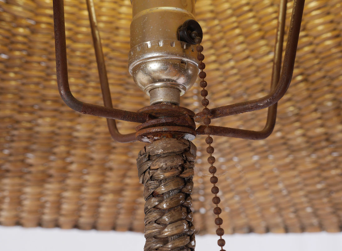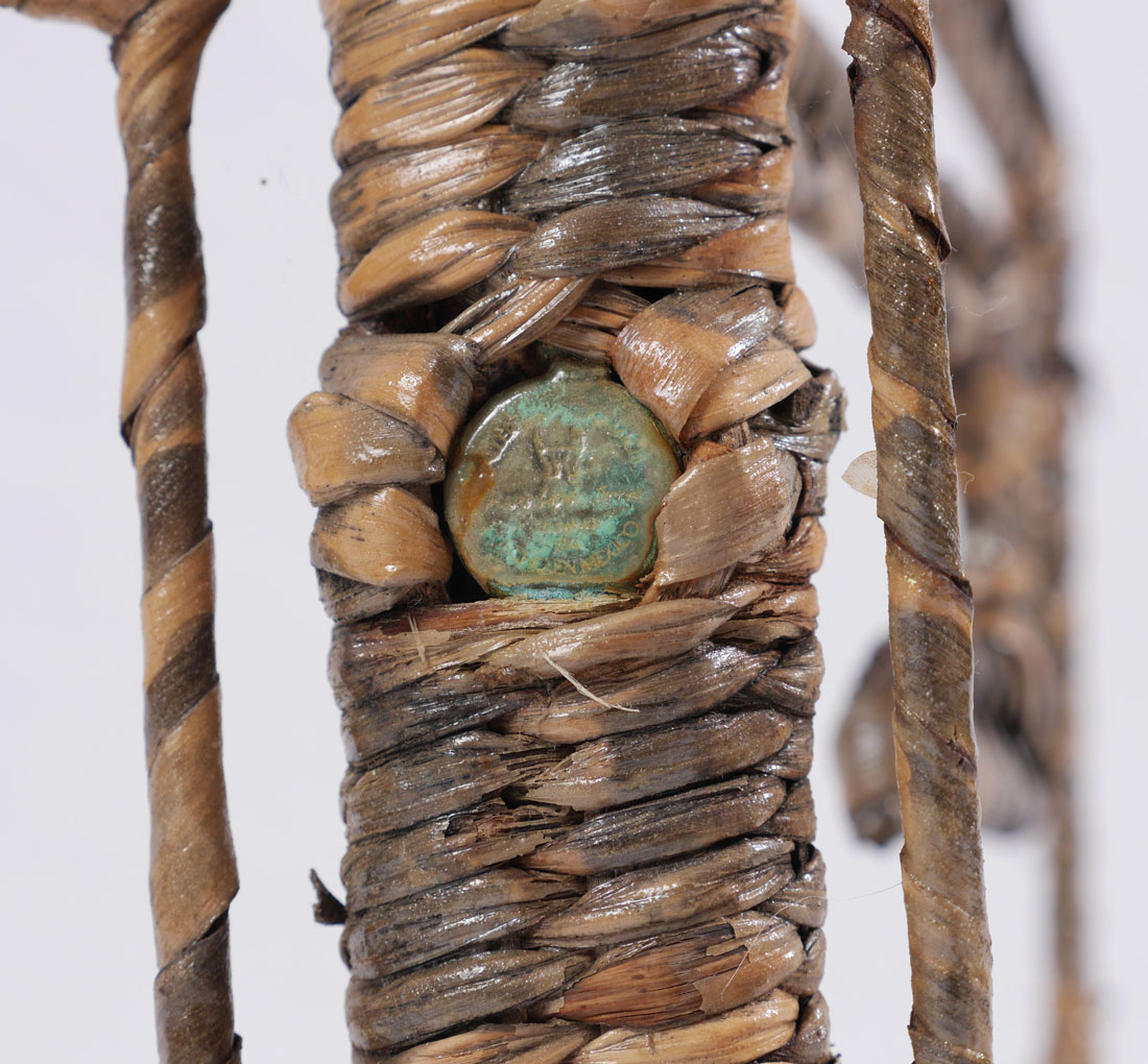 CONDITION: Areas of discoloration to wicker, tag has verdigris.