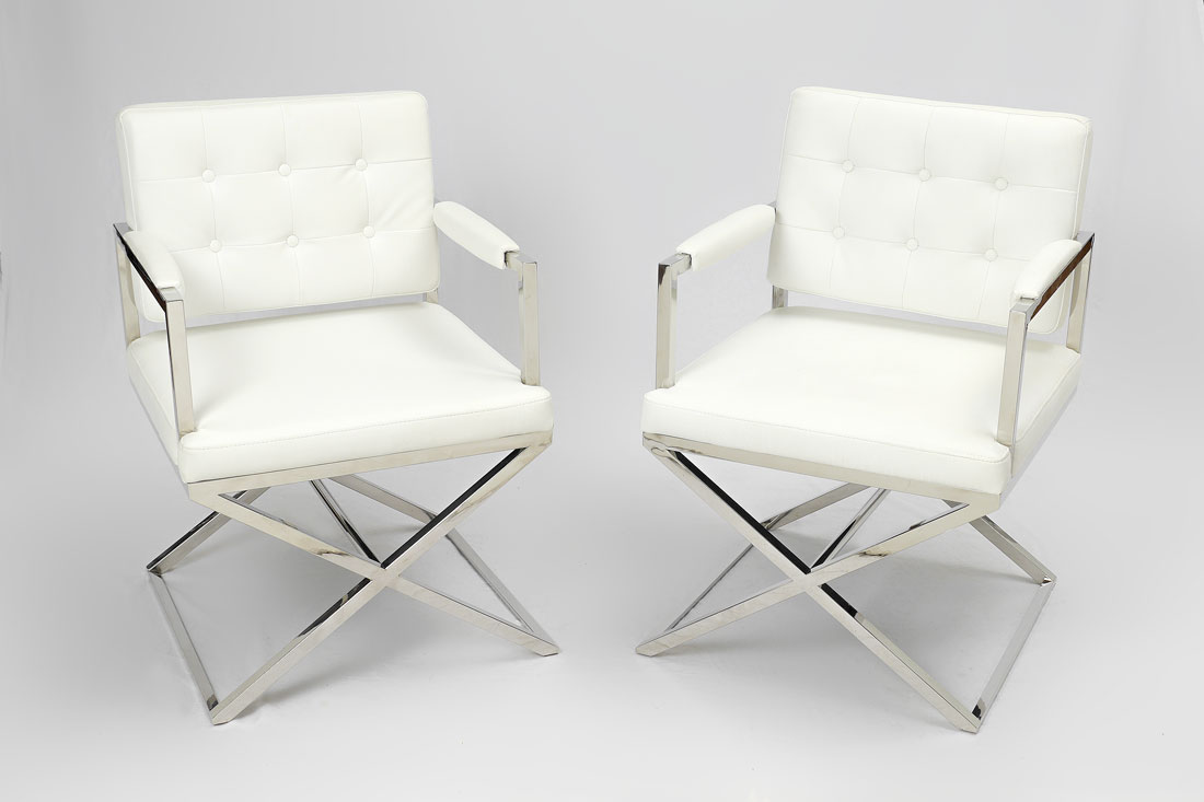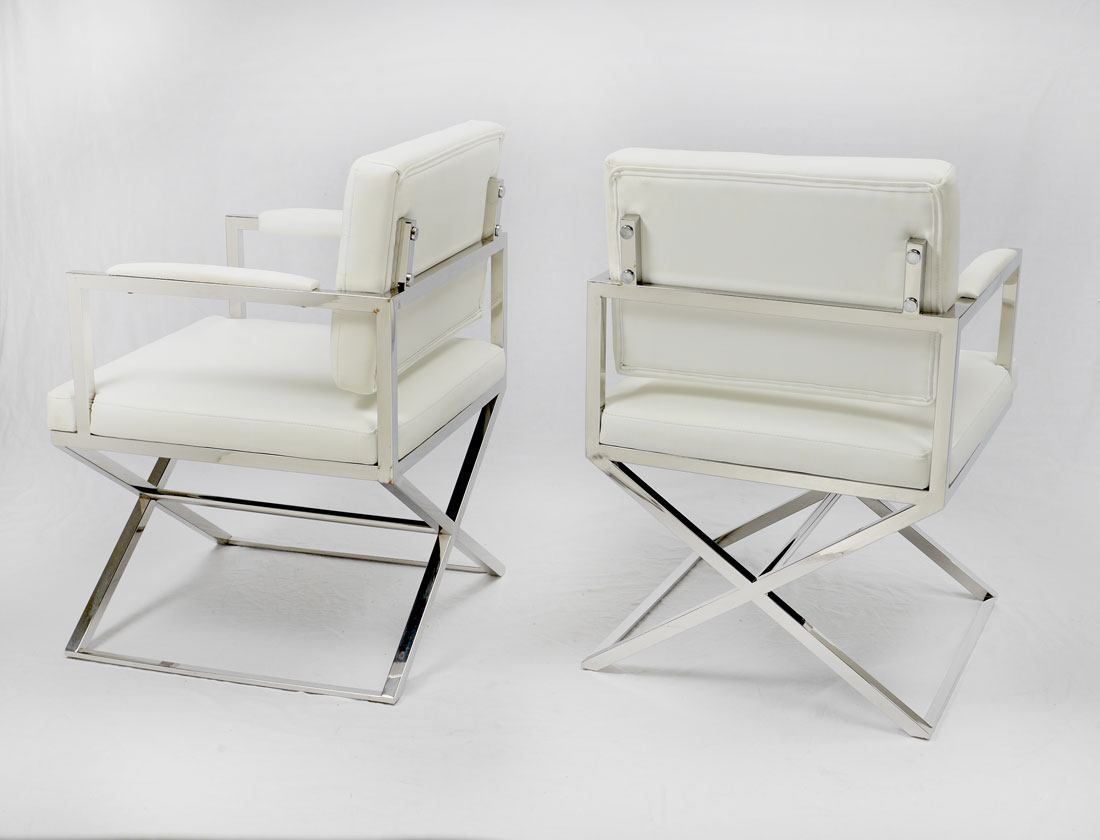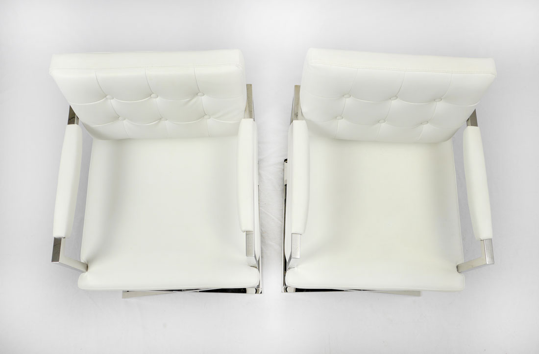 PAIR CONTEMPORARY CHROME CHAIRS AFTER BAUGHMAN: In the style of Milo Baughman, chrome frames and X form legs, white leather seat, tufted back, and arm rests. Measures 34 3/4'' h. x 23'' x 26 1/2''.
