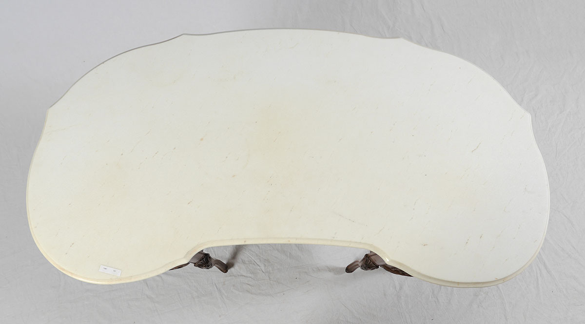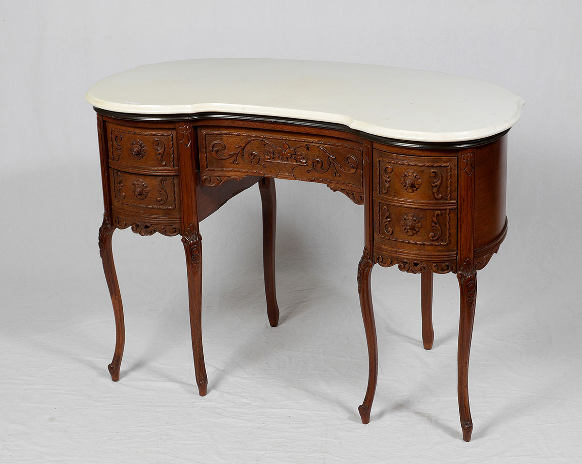 DIMINUTIVE MARBLE TOP KIDNEY WRITING DESK: Kidney shaped white marble top, base with central drawer flanked by 2 drawers either side, all with carved fronts. Carved and shaped legs, overall 31'' h. x 43 1/2'' x 21''.