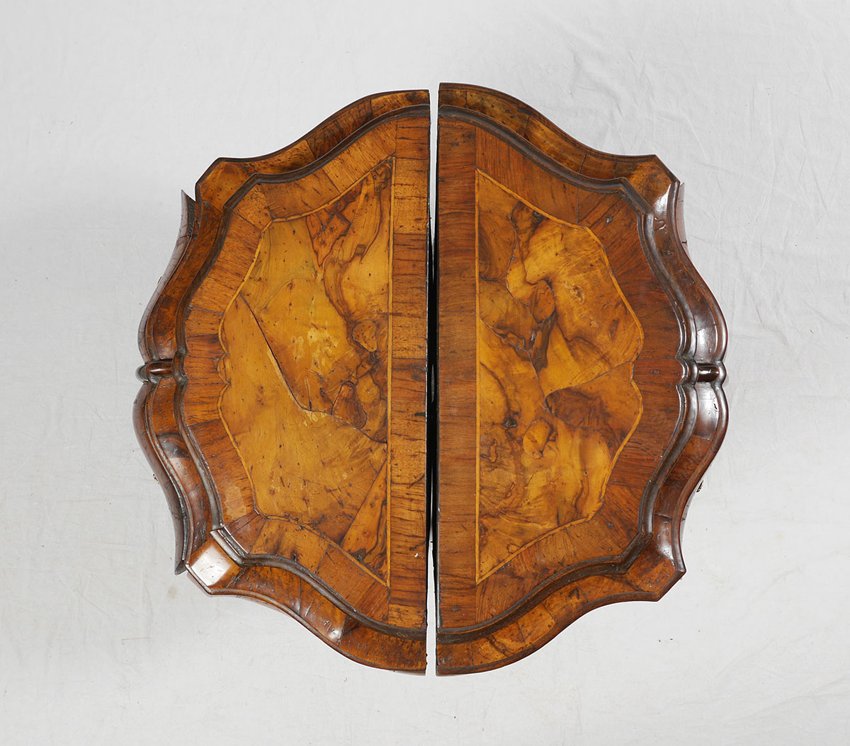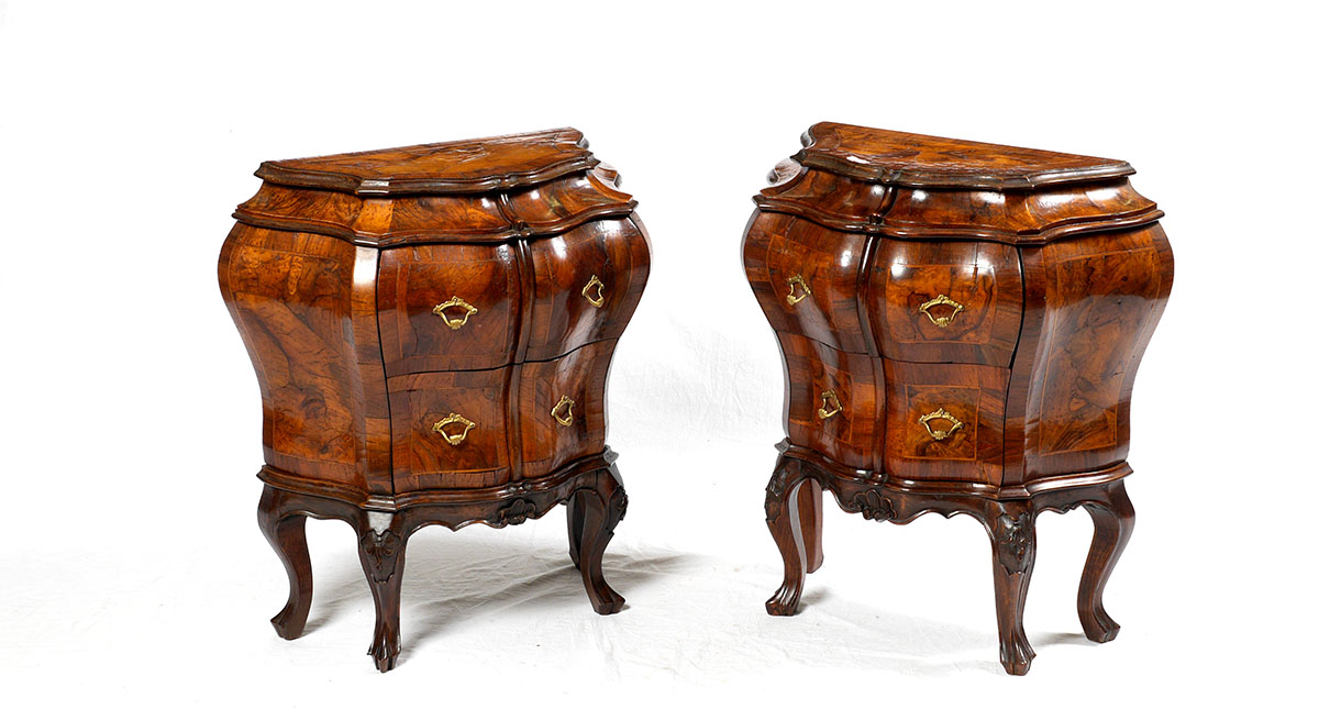 PAIR BOMBE NIGHT STANDS / END TABLES: Shaped top and bombe 2 drawer body, carved skirt and legs. No visible tags or marks, 28 1/2'' h. x 26'' x 12 1/2''.