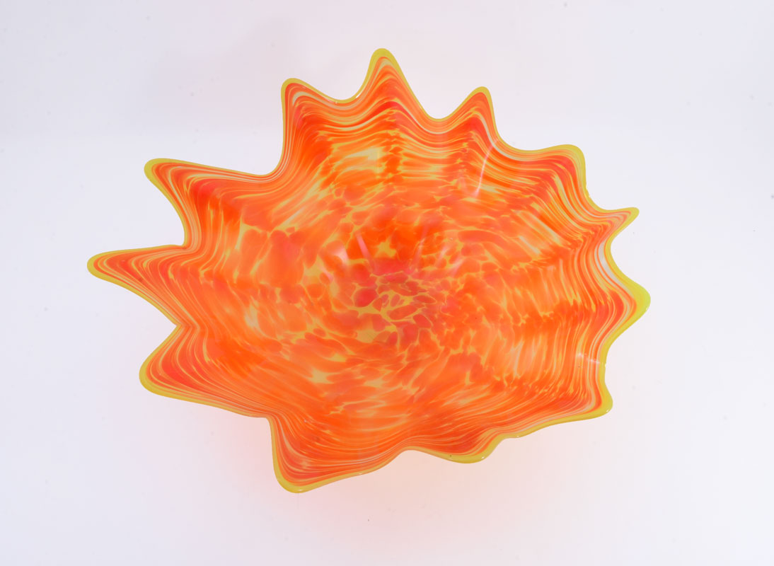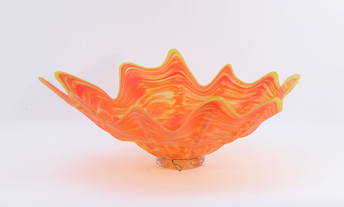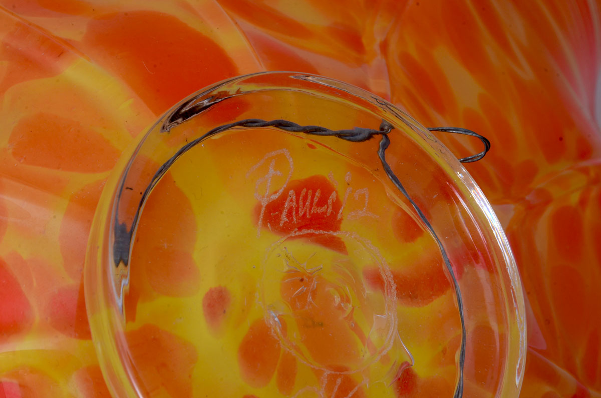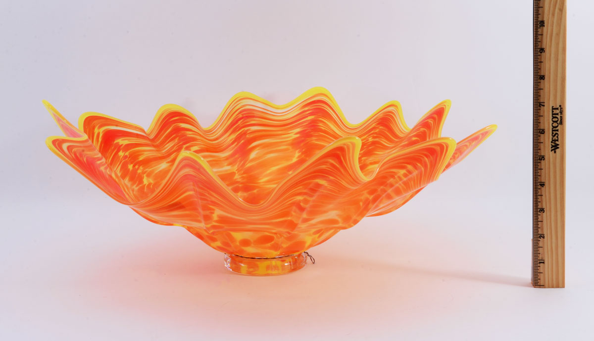 MAIVILLE, Pauli, (American, Contemporary): Large art glass footed spinout bowl, scalloped rim, fluted and shaped body with yellow and orange fused glass, clear foot, local artist signed Pauli 2012, 7'' h. x 18 1/2'' dia.