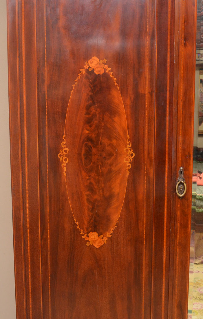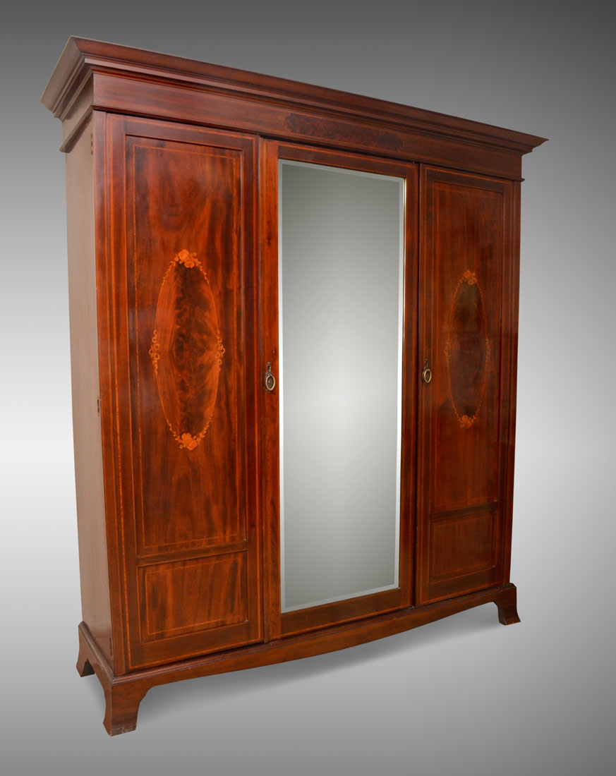 INLAID MAHOGANY TRIPLE DOOR ARMOIRE: Stepped cornice, center beveled glass mirror door opens to interior sliding shelves over drawers. The 2 side doors with inlaid floral medallions, open to hanging coat racks, overall 85'' h. x 76 3/4'' x 24 1/2''.