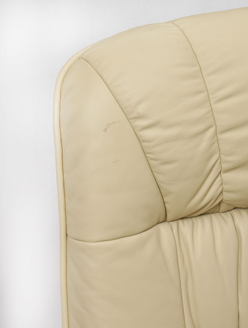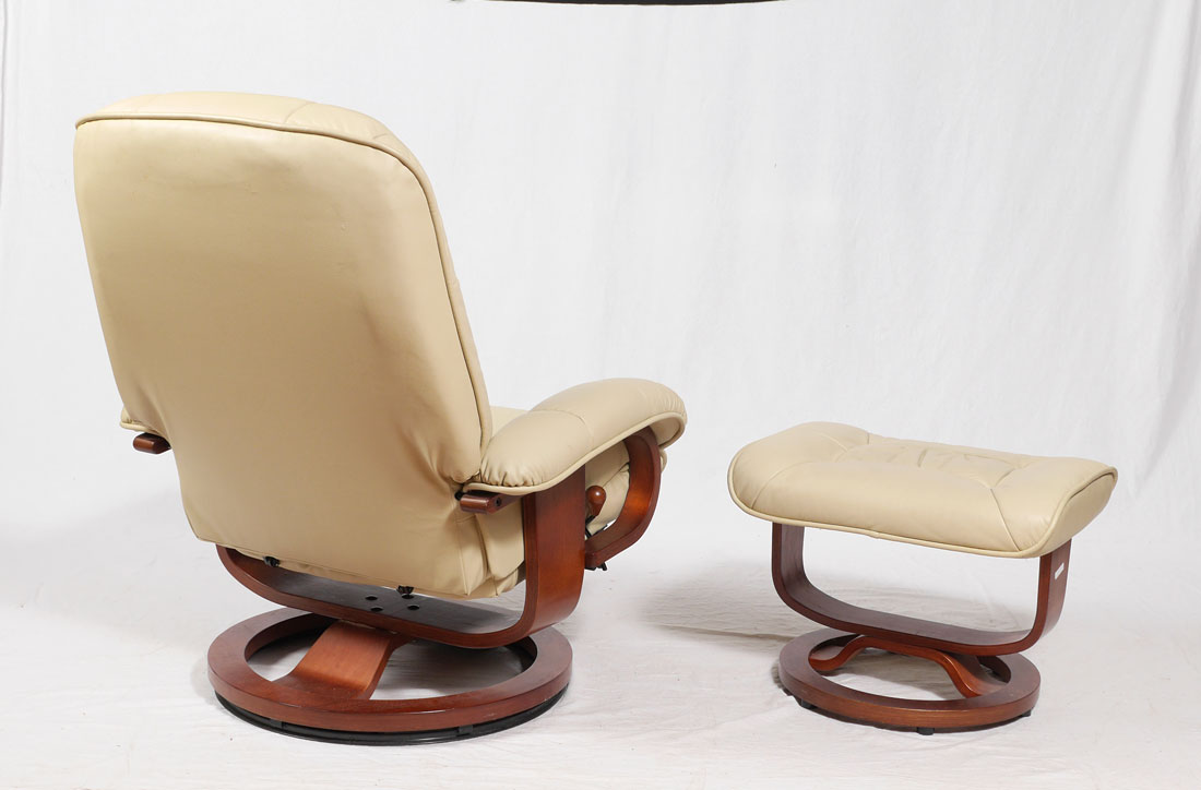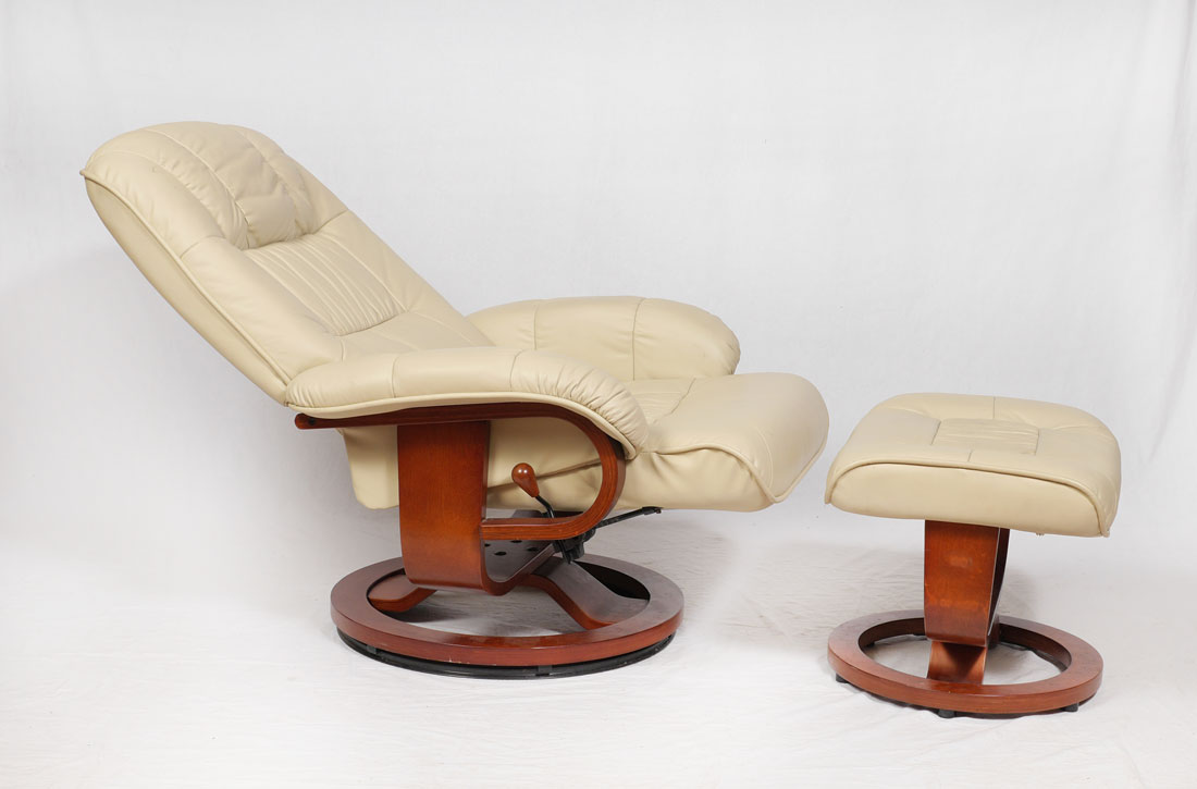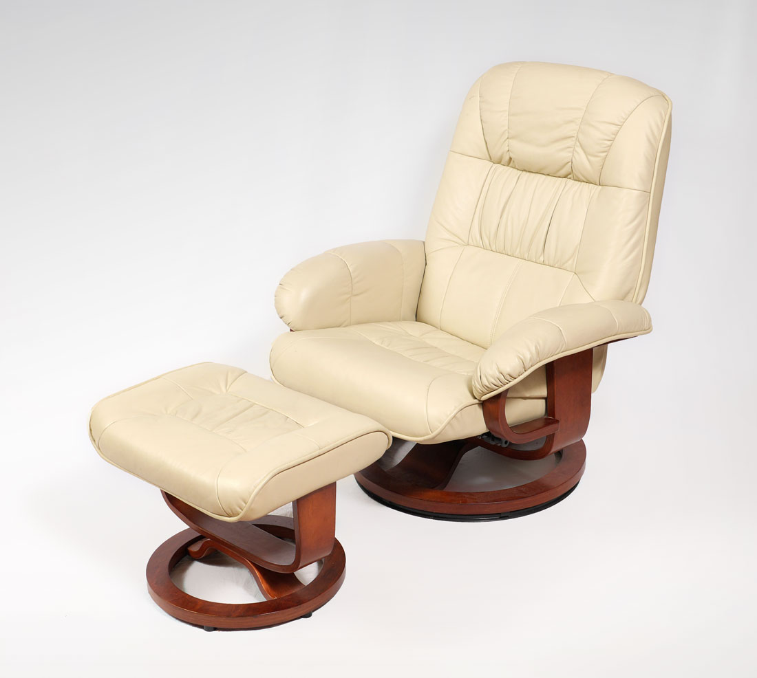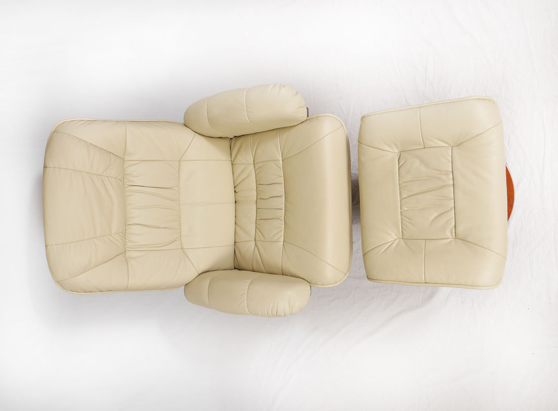 LEATHER RECLINING CHAIR AND FOOT STOOL: In the style of a Stressless chair, cream leather recliner, no visible tag, 39 3/4'' h. x 33 1/2'' x 36''. Sold with the matching ottoman, 17'' h. x 22 1/2'' x 18''.