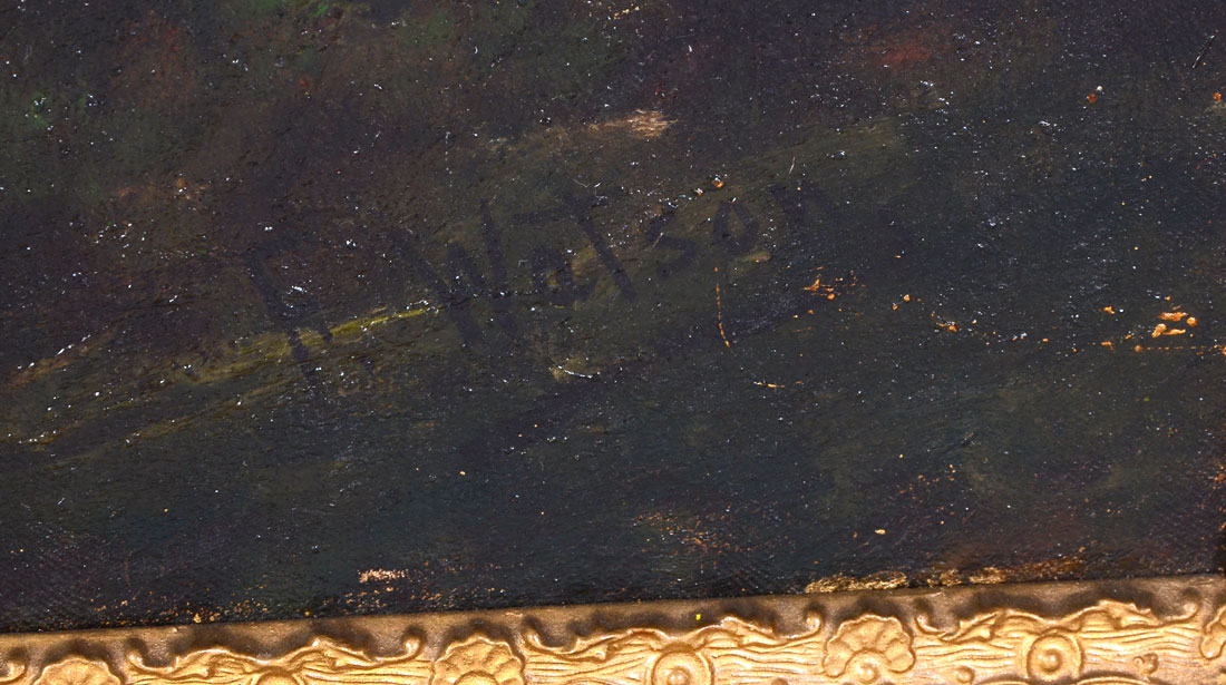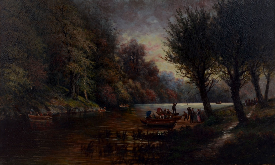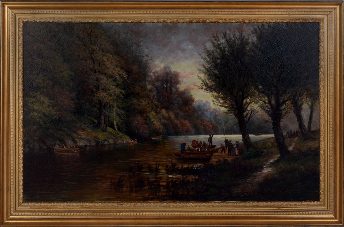 RIVER SCENE GENRE PAINTING WITH TOURIST BOATS: Oil/Canvas, sight size is 30'' x 50'', signed lower right Robert F. Watson, framed 37.50'' x 57''.