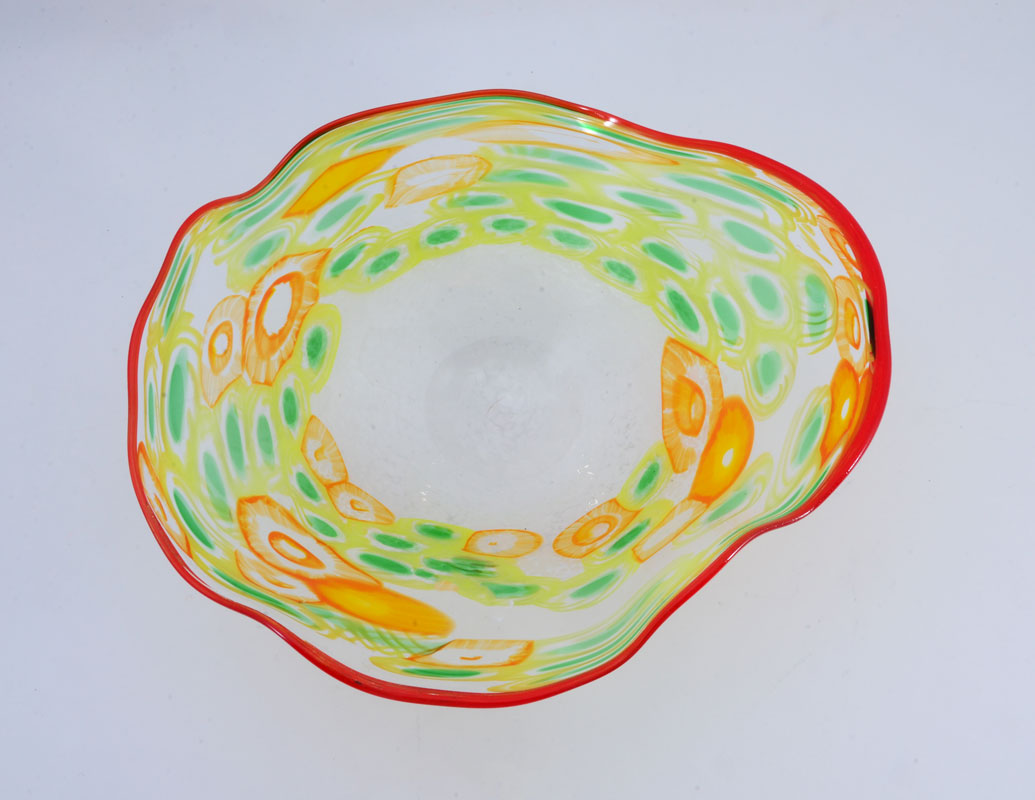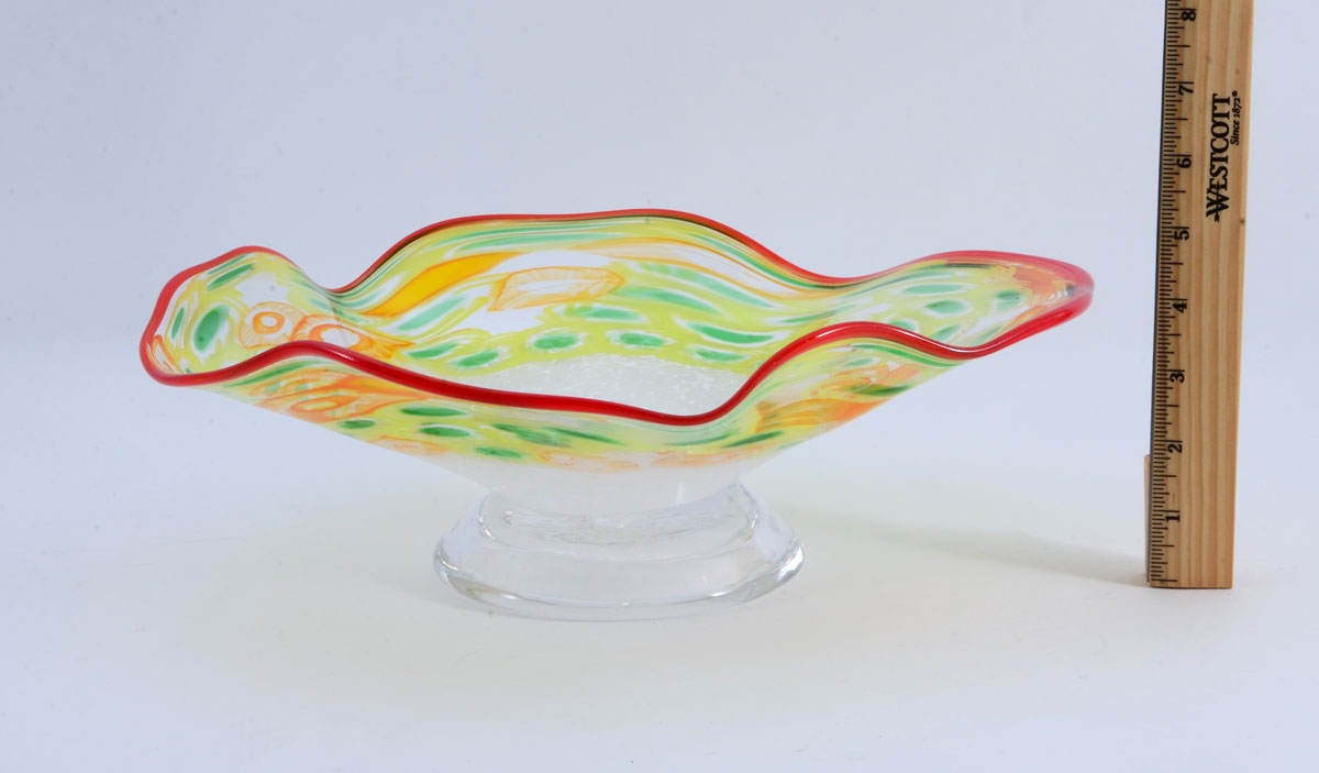 SPURGEON, David, (American, Contemporary): Art glass spinout bowl with red scalloped edge, polychrome fused, fluted and shaped body, clear foot, local artist signed David C. Spurgeon, 2014, 4'' h. x 13 3/4'' x 11 1/2''