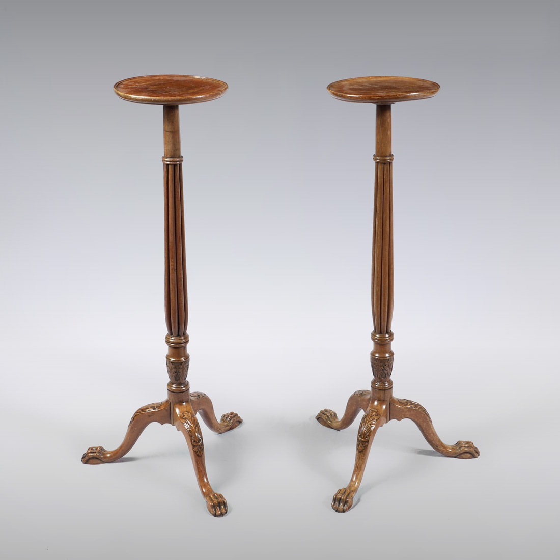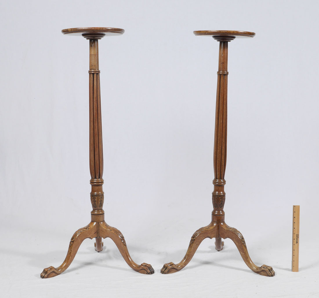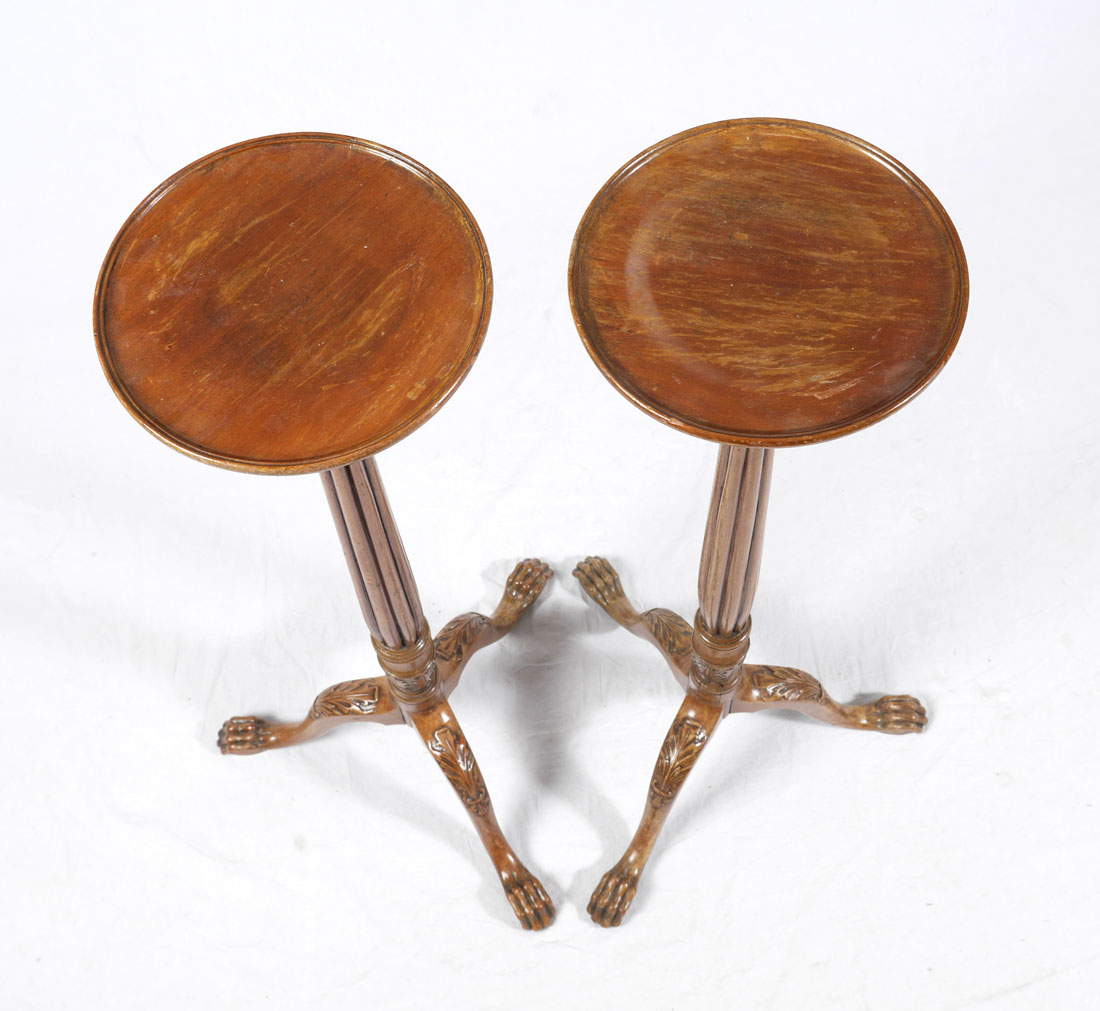 PAIR OF EDWARDIAN CARVED WOOD PLANT STANDS: Round tops, fluted body, on 3 carved splayed legs ending in paw feet. 42 3/4'' h. x 11'' top dia, 21'' base dia.