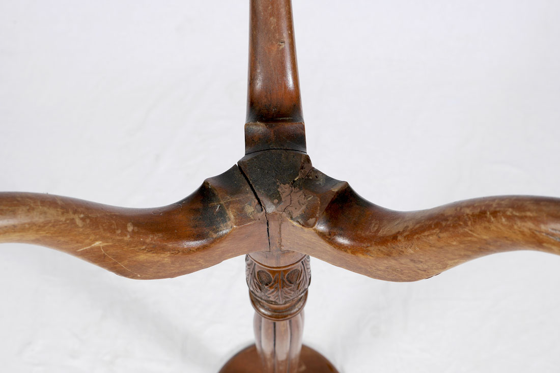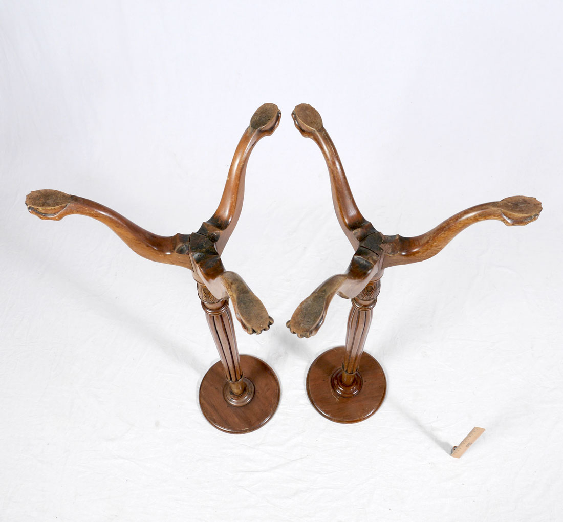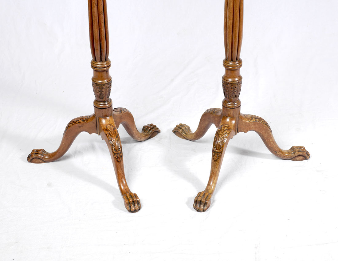 PAIR OF EDWARDIAN CARVED WOOD PLANT STANDS: Round tops, fluted body, on 3 carved splayed legs ending in paw feet. 42 3/4'' h. x 11'' top dia, 21'' base dia.