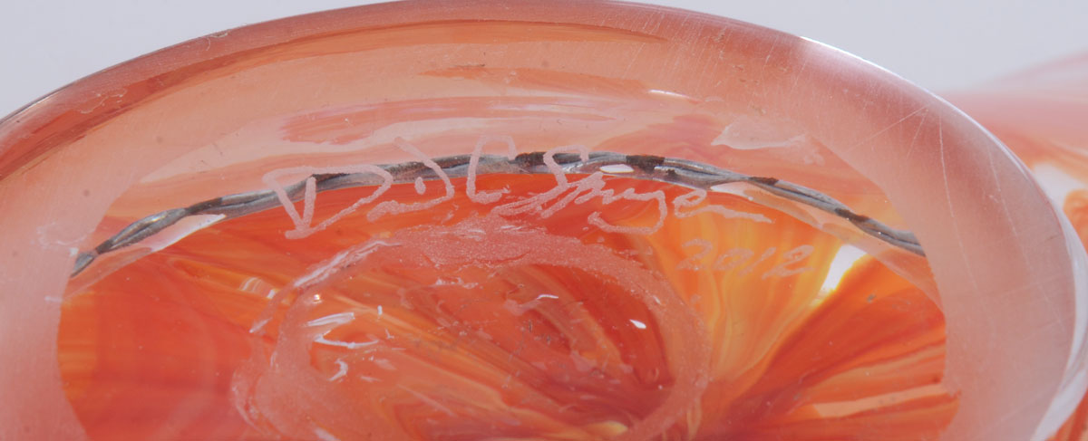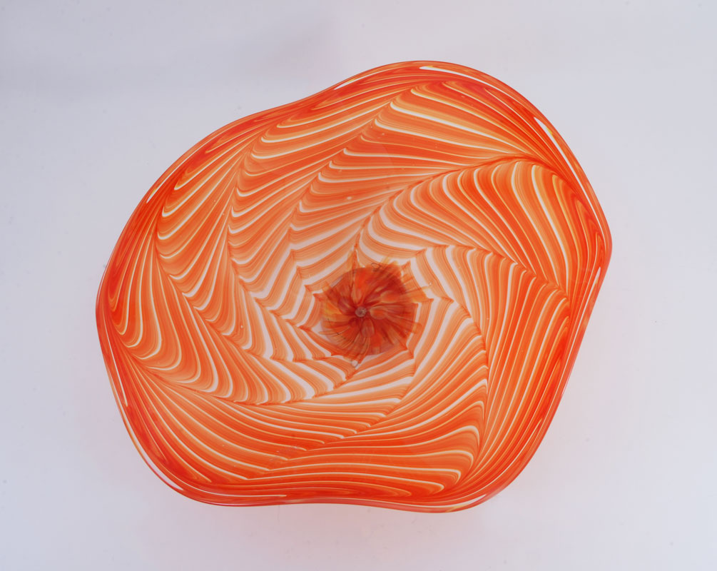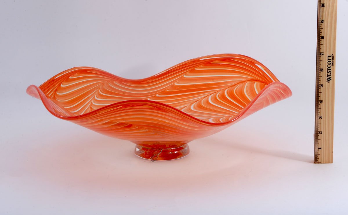 SPURGEON, David, (American, Contemporary): Art glass spinout bowl with scalloped edge, orange and yellow fused, fluted and shaped body, clear foot, local artist signed David C. Spurgeon, 2012, 5 1/2'' h. x 16 1/2'' dia.