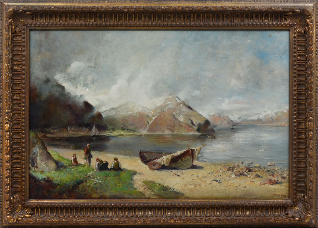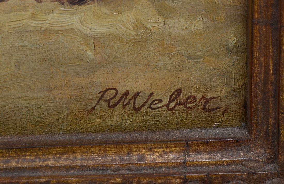 LAKESIDE GENRE PAINTING SIGNED R WEBER: Oil/Canvas, 20'' x 30'', signed lower right, encased in Michael Murphy custom fine framing, 26'' x 36''.