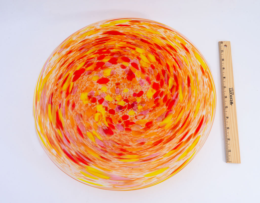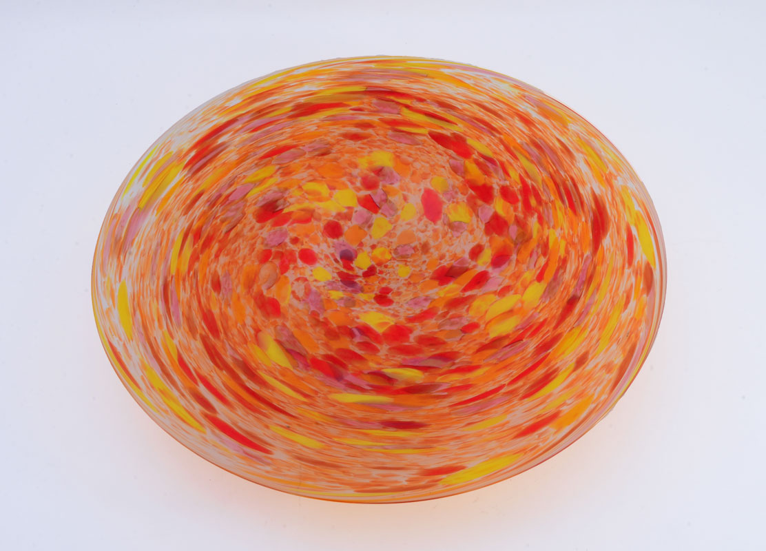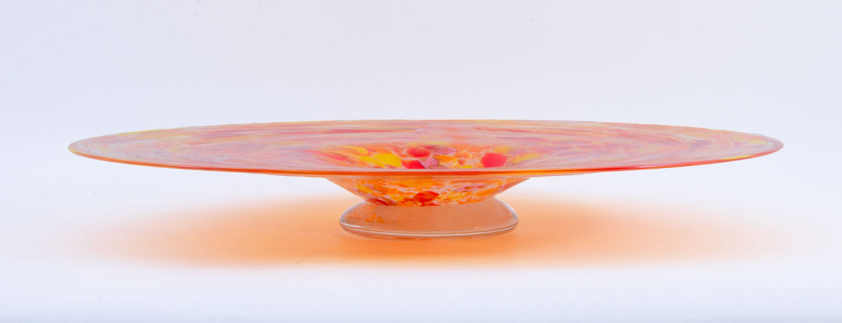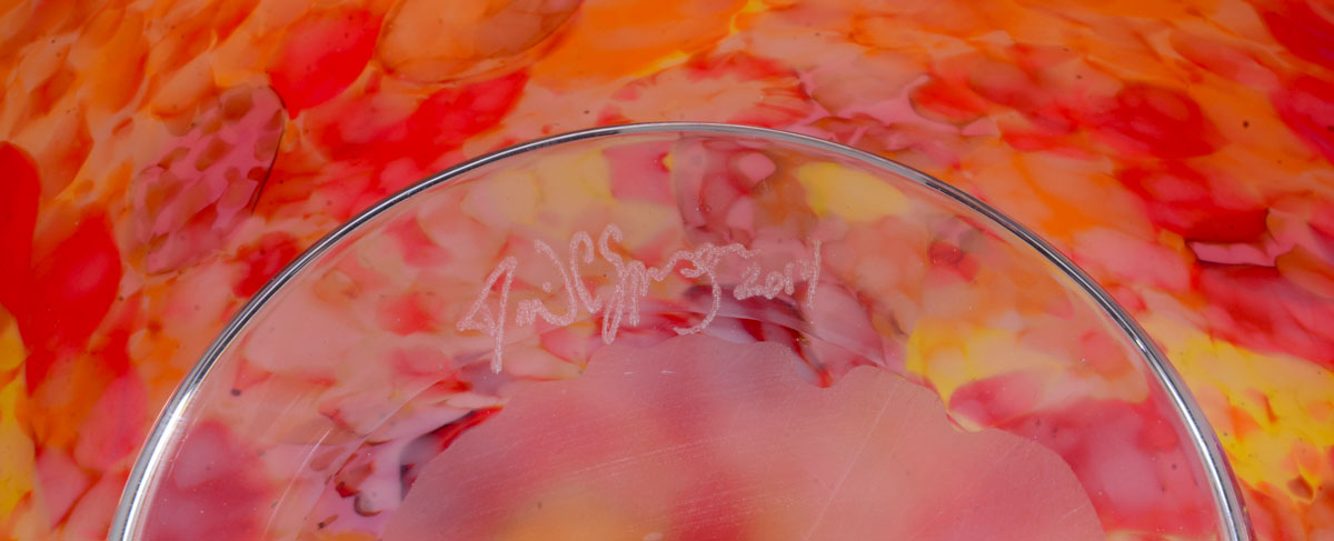 SPURGEON, David, (American, Contemporary): Art glass spinout charger with round edge, polychrome red, yellow and orange fused, shaped body, clear foot, local artist signed David C. Spurgeon, 2014, 2 1/8'' h. x 16 1/4''.