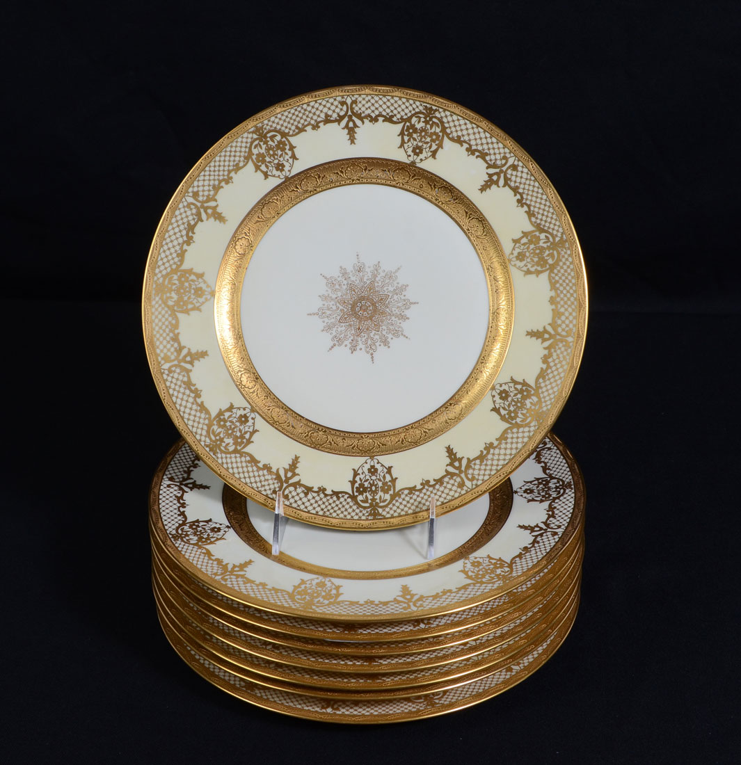 8 HEINRICH & CO. GOLD RIM SERVICE PLATES: Cream ground, gold decorated rim, inner band, and center medallion, marked on back with H & Co. mark, retailers mark John Wanamaker, New York, 11'' dia.