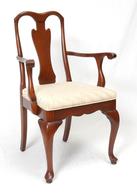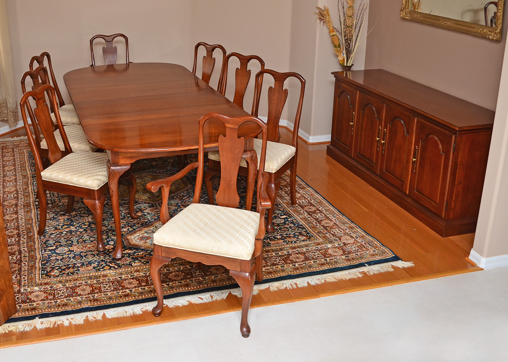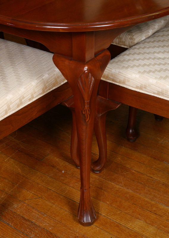 MAHOGANY DINING TABLE, SIDEBOARD AND 8 CHAIRS: Top with rounded corners, carved and shaped legs, measures 30'' h. x 64 1/2'' x 42'', the two leaves measure 16''. 4 doors sideboard measures 30 3/4'' h. x 66 1/2'' x 19 1/4''. Sold with 8 chairs, the two arm chairs measure 38 3/4'' h. x 25 1/2'' x 22''.