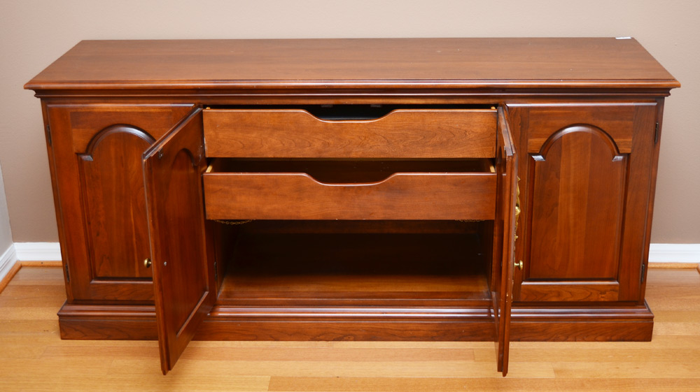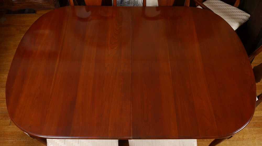 CONDITION: Top with areas of discoloration, chairs with scratches, sideboard with scratches.