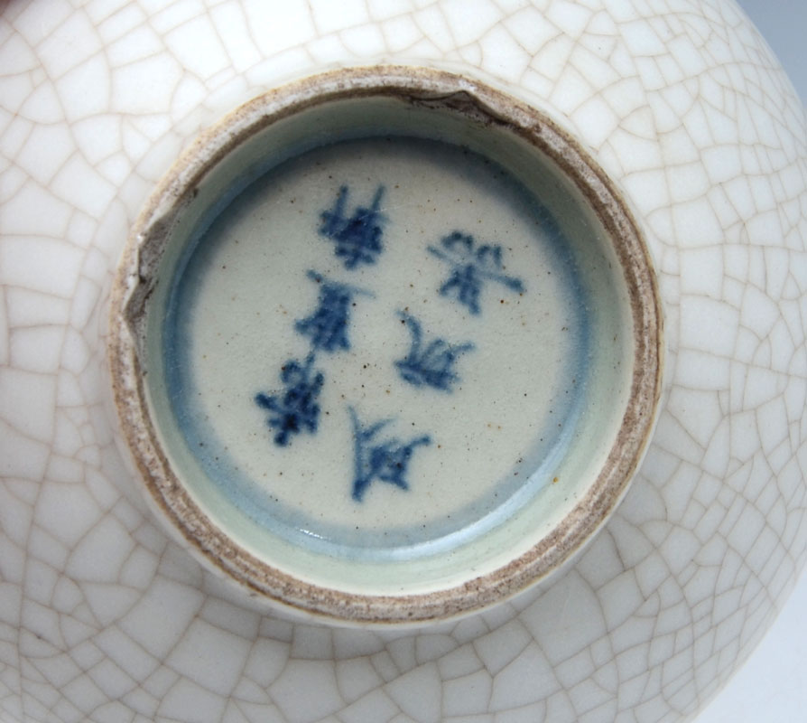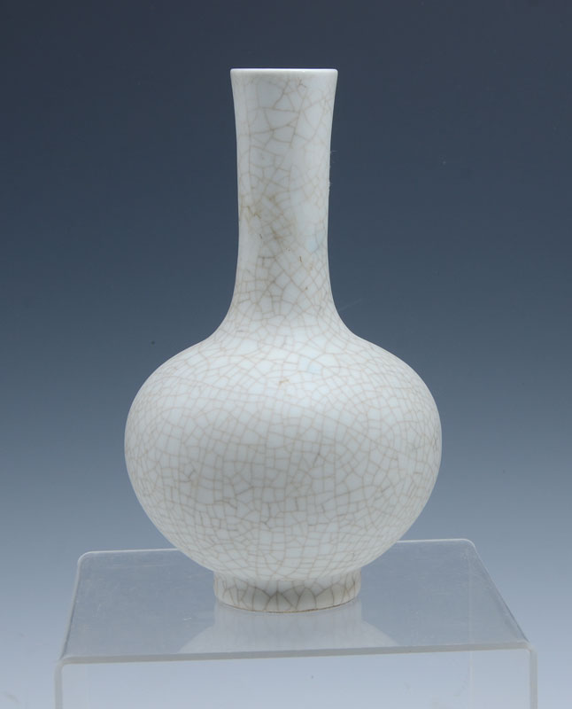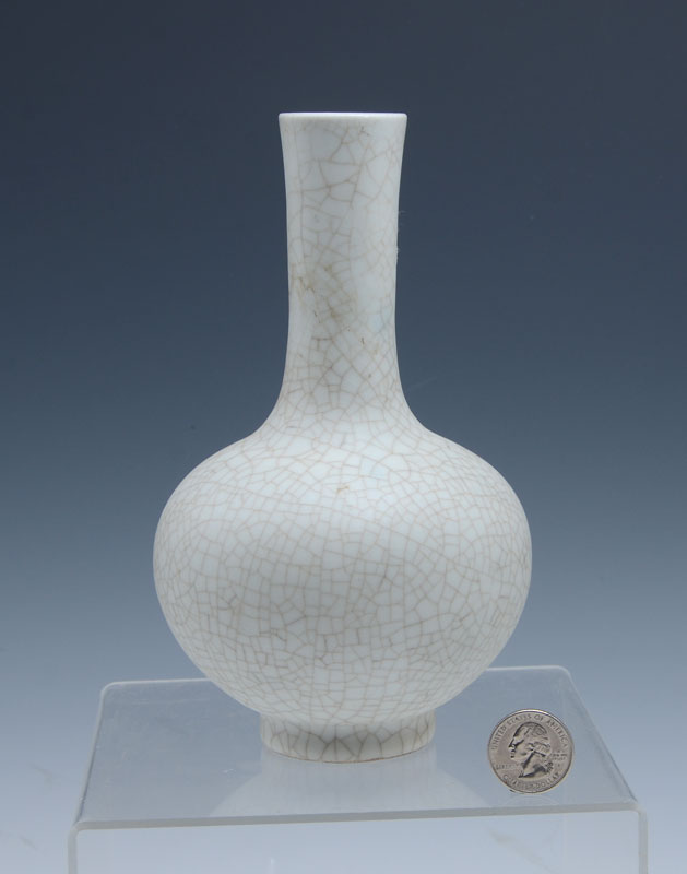 CHINESE EXPORT WHITE CRACKLE GLAZE VASE: Tall neck vase with bulbous body, footed base, crackle glaze. Illegible marks on base, actual age unknown, 7 1/2'' h. x 4 1/2''.