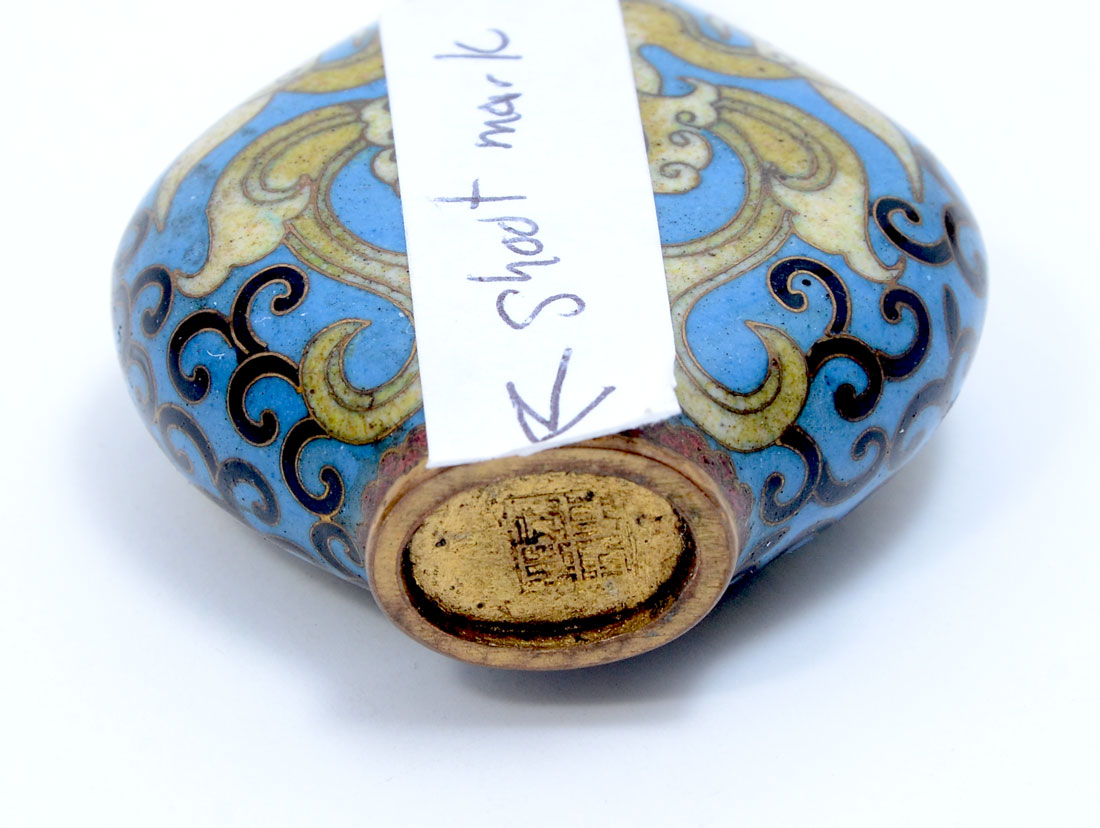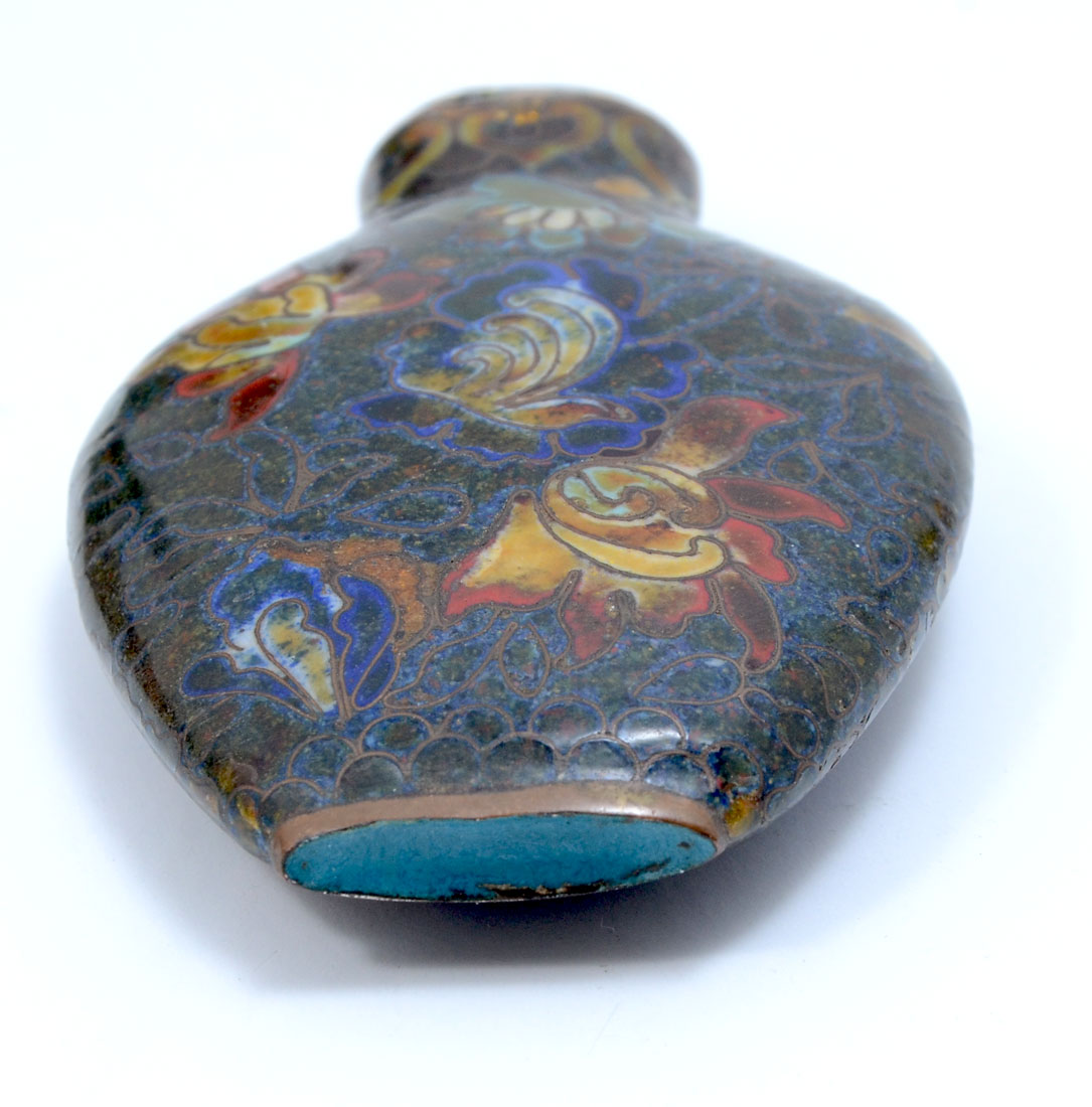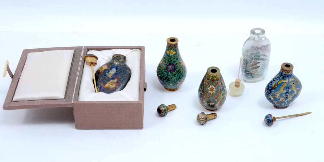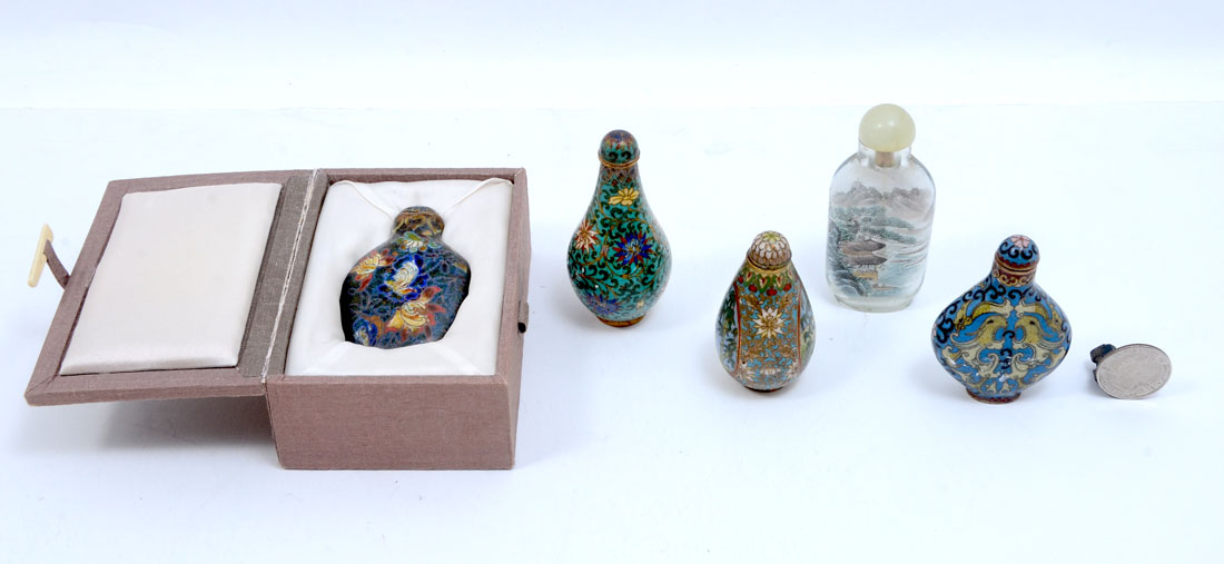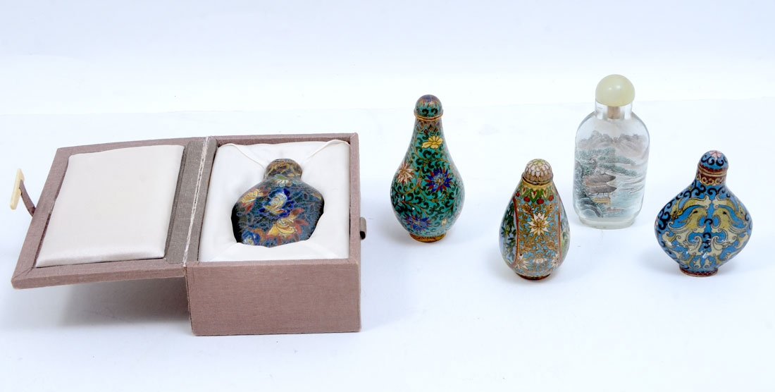 5 CHINESE CLOISONNE & GLASS SNUFF BOTTLES: 5 pieces total, the 4 cloisonne examples to include 1) Compressed bottle form with figural dragons, 4 character (Qing?) mark on base, 2 1/2'' h. 2) Bottle form with figural panda bears in medallions, 2 1/2'' h. 3) Floral motif bottle form 3'' h. 4) Floral compressed bottle form 2 3/4'', with fitted box. Sold with 5) Reverse painted landscape scene, stone finial, 3 1/4''.