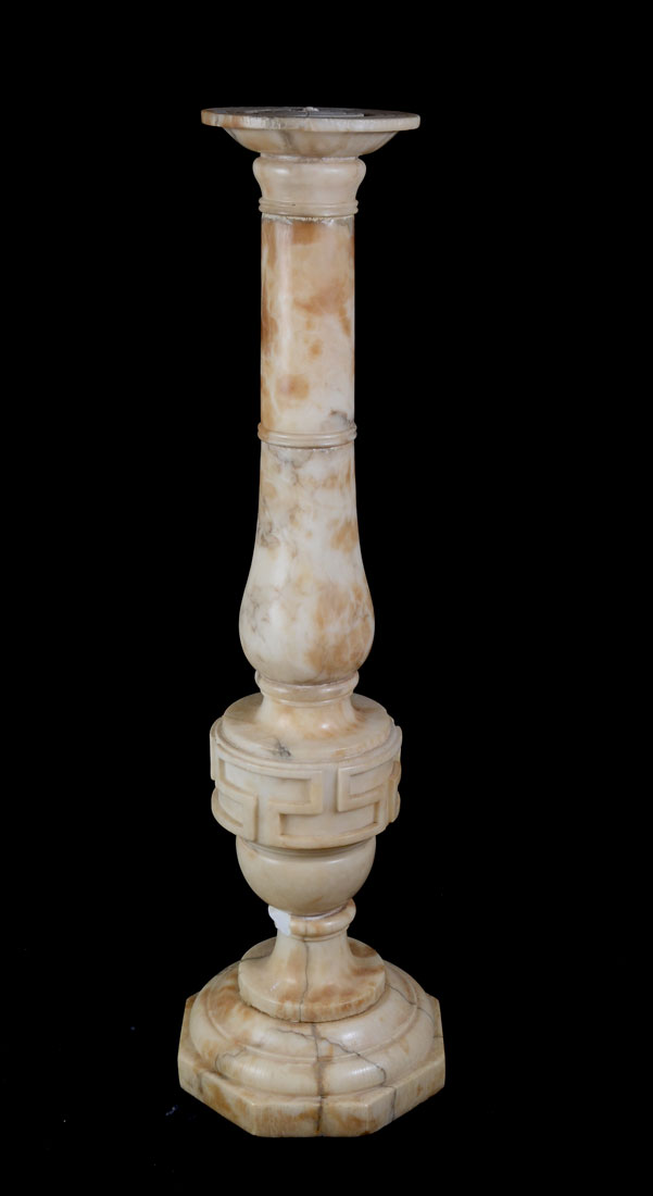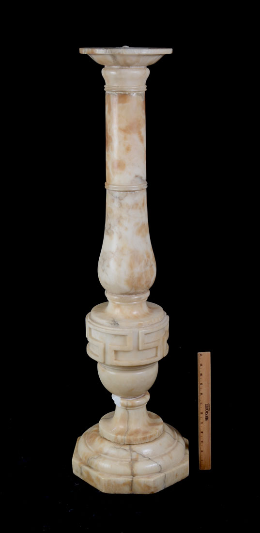 CARVED MARBLE PEDESTAL / PLANT STAND: Variegated white marble pedestal, shaped shaft over carved urn form over octagonal base. Appears to have had and additional top piece at some time, now missing. Measures 40'' h. x 8'' top dia, 11 1/2'' base dia.