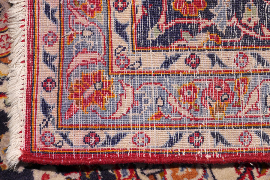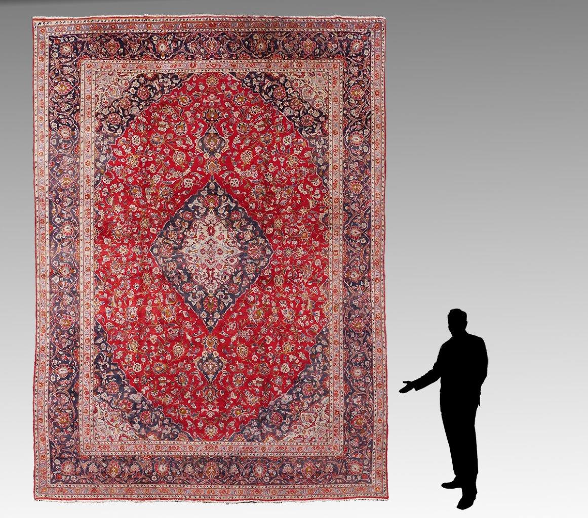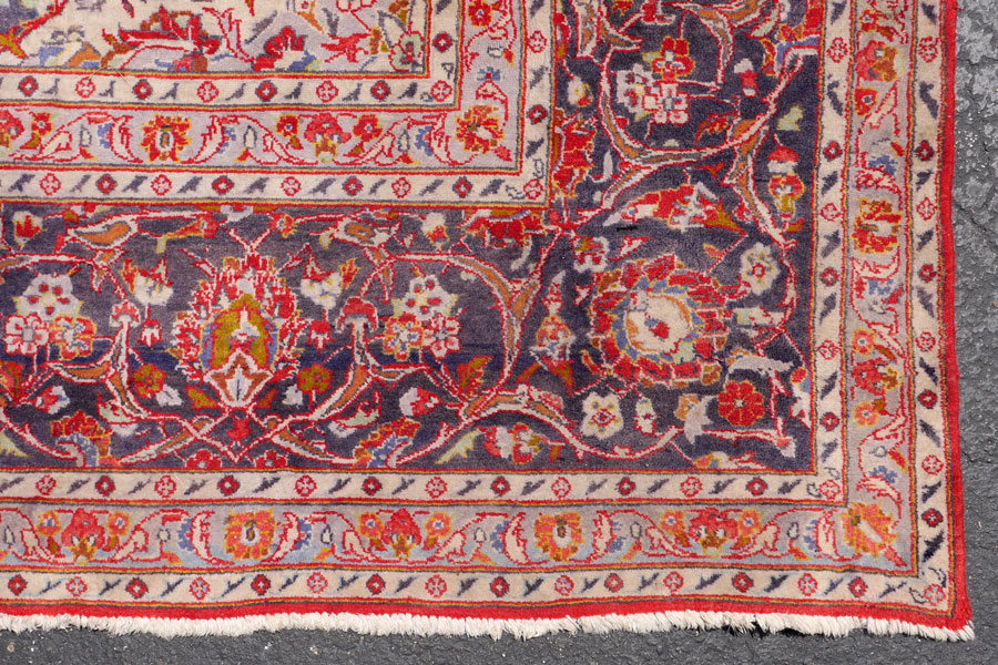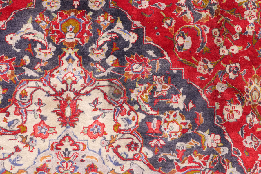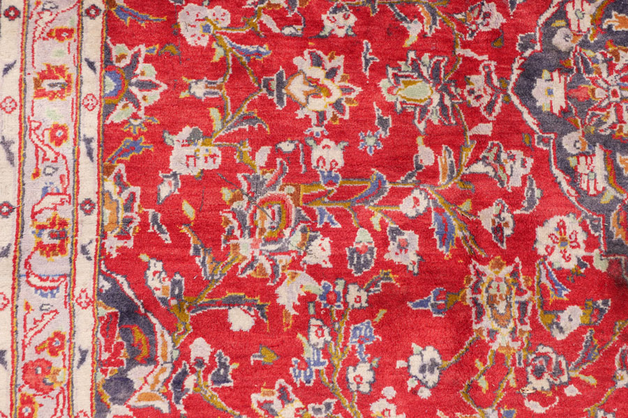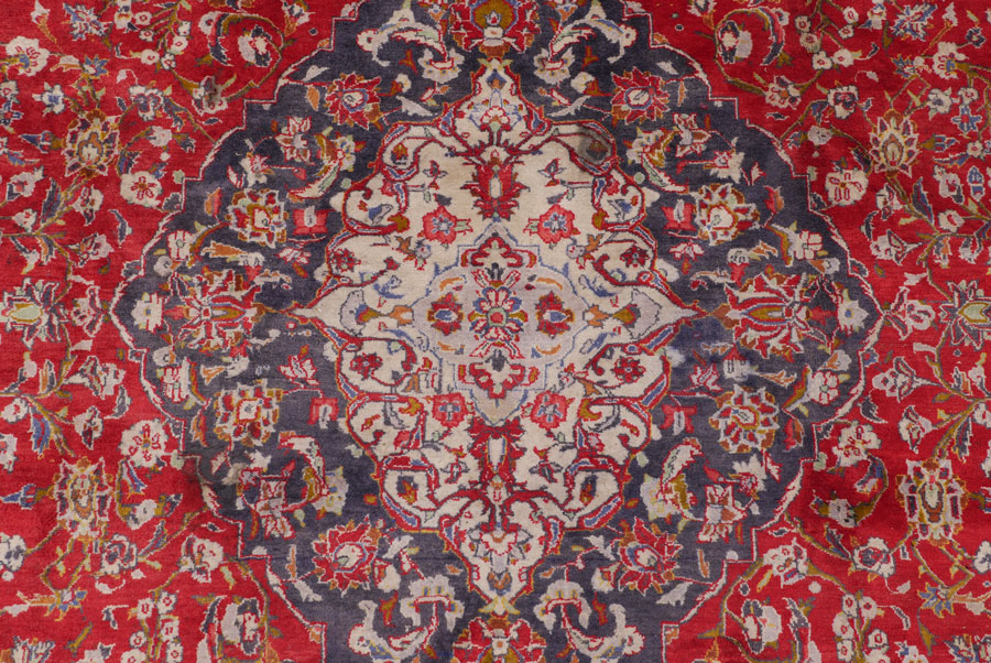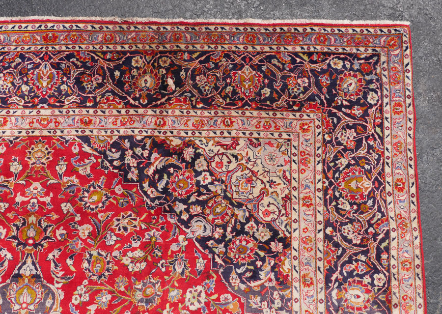 SEMI-ANTIQUE PERSIAN TABRIZ HAND KNOTTED WOOL RUG, 10' X 14': This Tabriz has a classic design format with a diamond shaped medallion within a medallion in blue and white and with spandrels at either end. The corners match the medallion in color and the rest of the field is a vibrant red color. Over the field are flowers and palmettes linked by vines. Six guard borders in white and pale blue and the wide dark blue main border complete the rug.