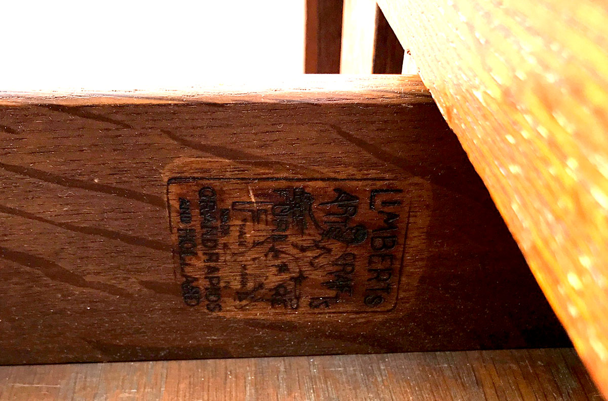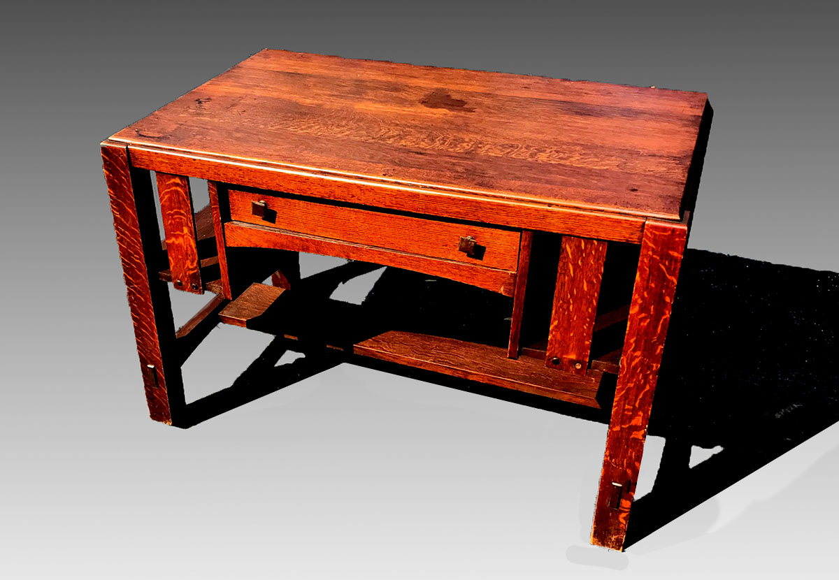 LIMBERT MISSION OAK ARTS & CRAFTS DESK: Library table or desk, single center door, slatted bookshelf sides, lower stretcher / foot rest. Branded mark inside drawer, 28 1/2'' h. x 45'' x 28''.