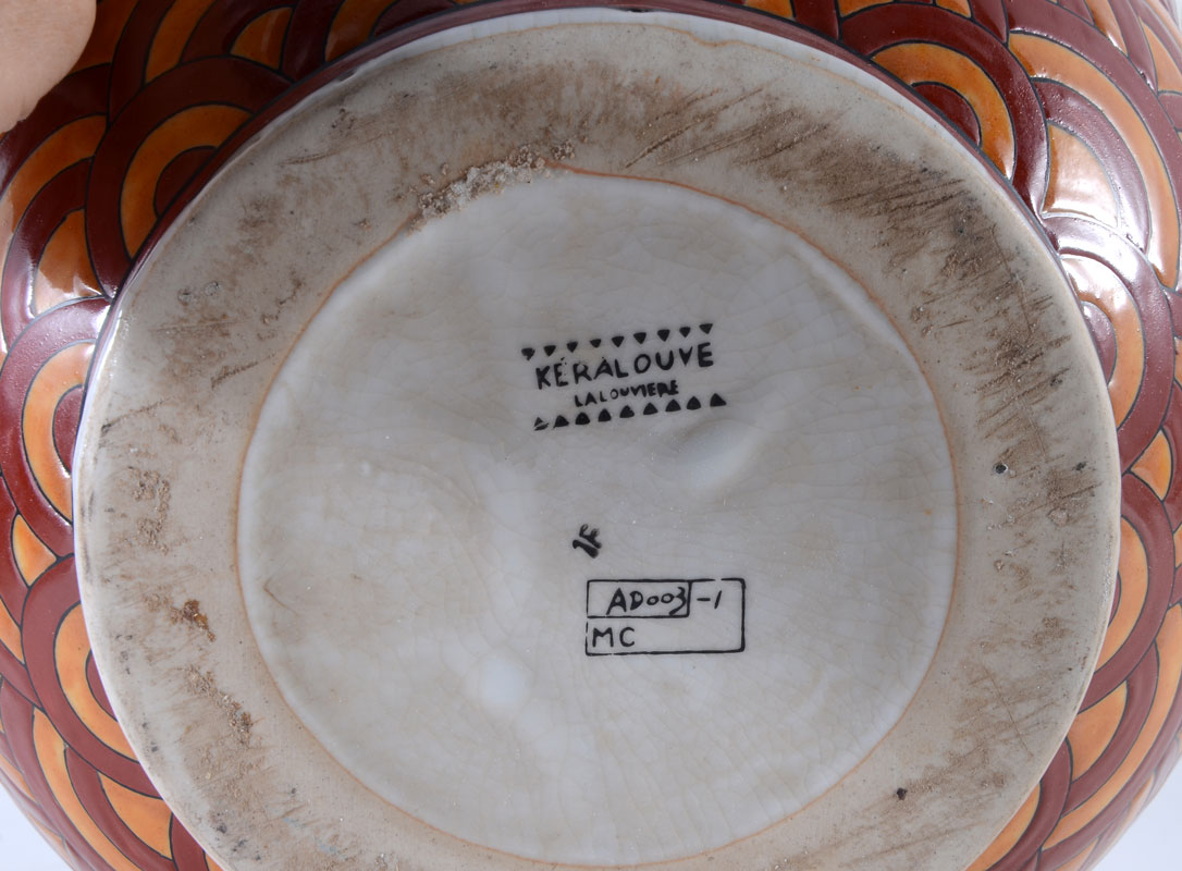 KERALOUVE LA LOUVIERE LARGE STORK VASE: Globe form vase with raised stork decoration, signed on base, in the style of Boch Keramis, overall 11 3/4'' h. x 11''.