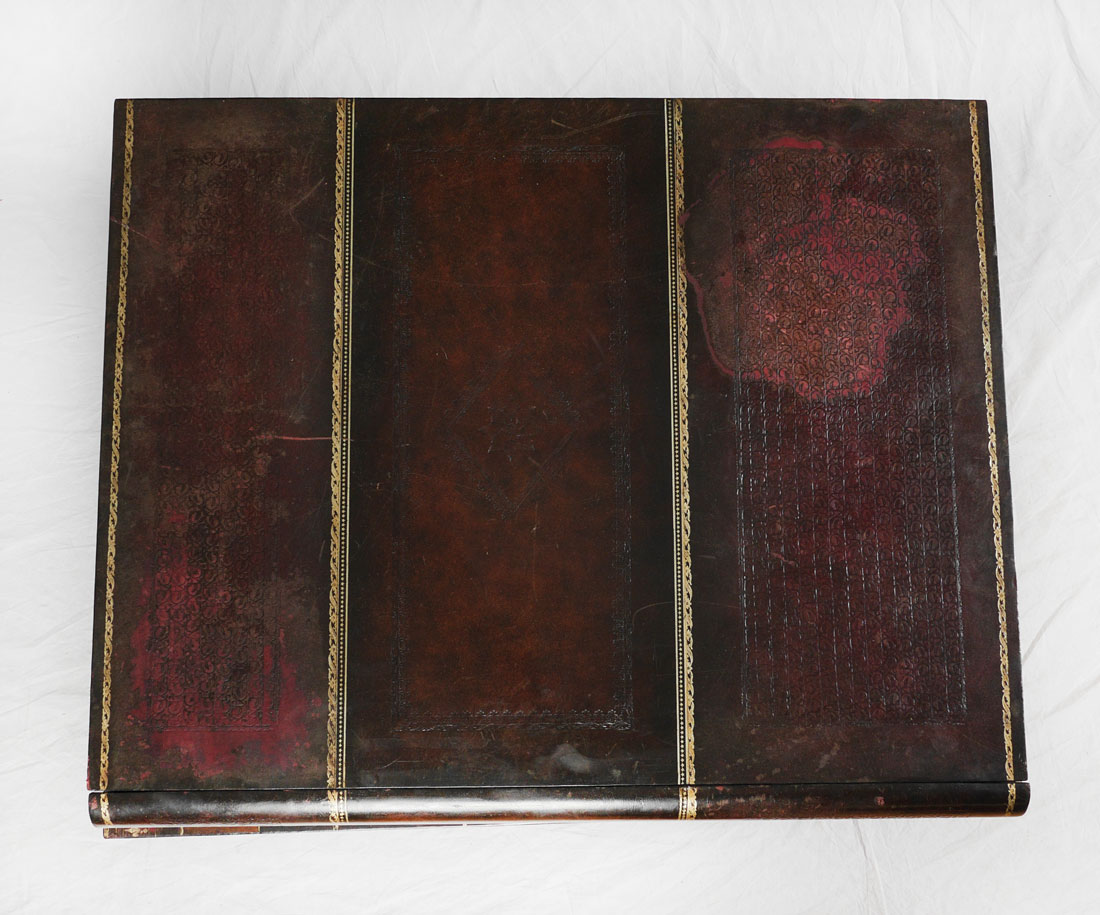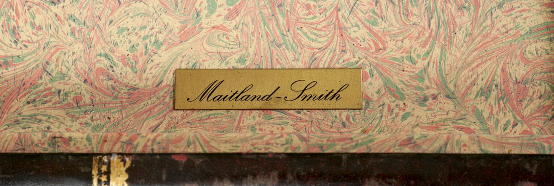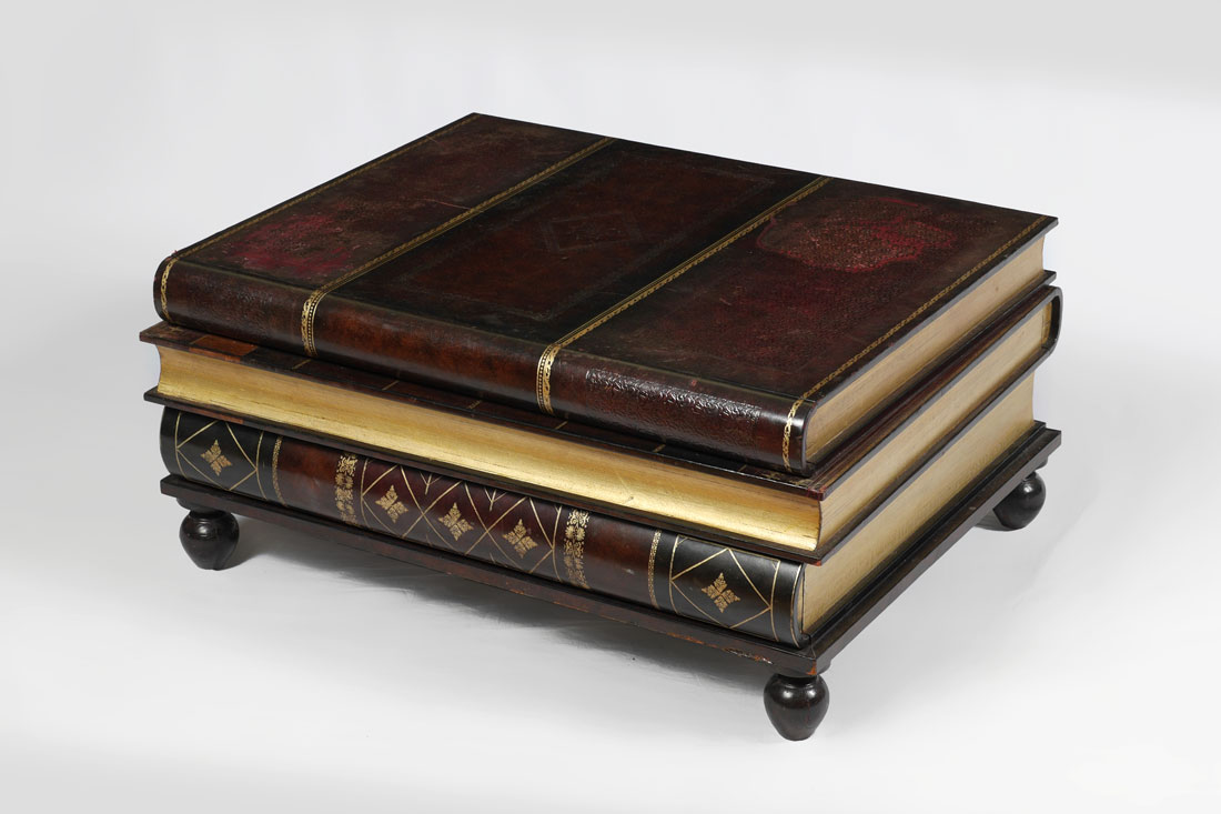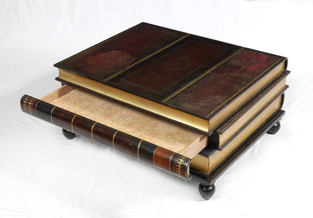 MAITLAND-SMITH STACKED BOOK COFFEE TABLE: Coffee table by Maitland-Smith in the form of 3 stacked books, each book spine a drawer. Overall measures 17 1/2'' h. x 35'' x 28''.