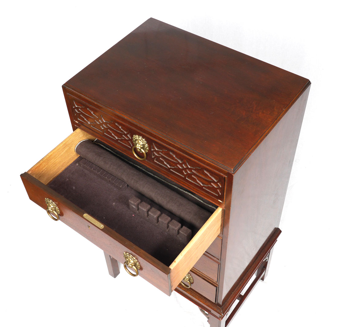 BAKER FURNITURE MAHOGANY SERVER / CHEST: From the Historic Charleston Reproductions line form Baker, Top drawer with applied carved front, second drawer is fitted silverware drawer, over three more drawers. 43 1/2'' h. x 24'' x 16 3/4''.