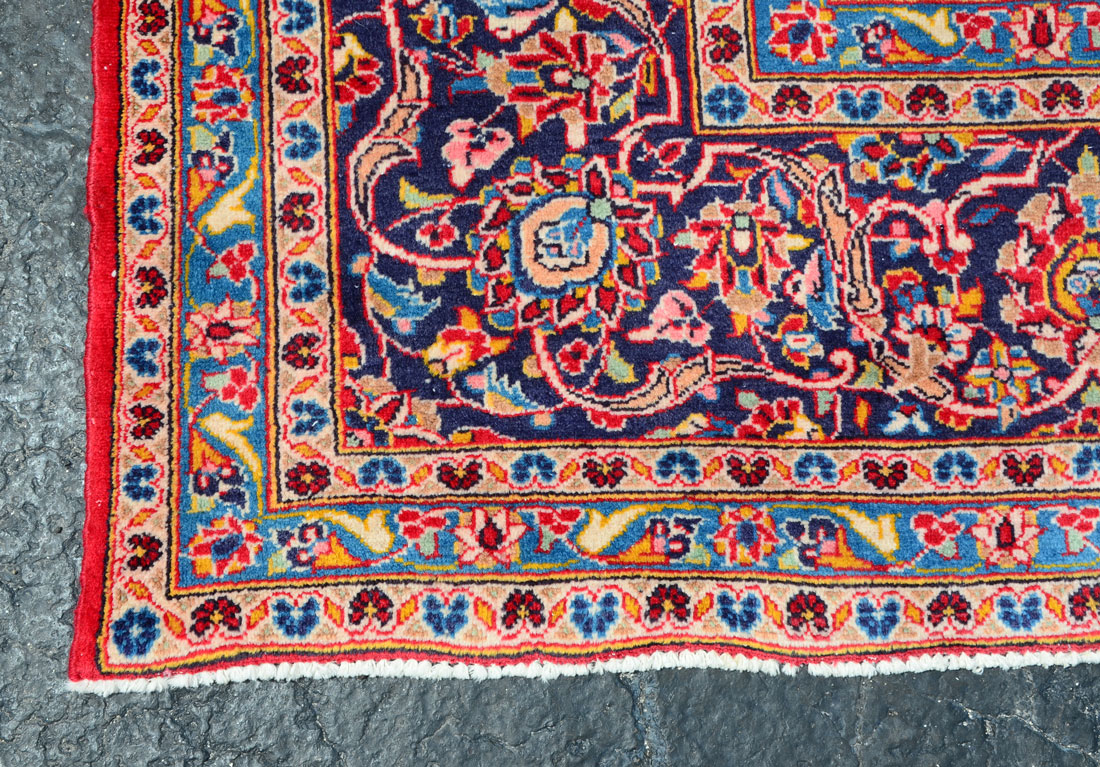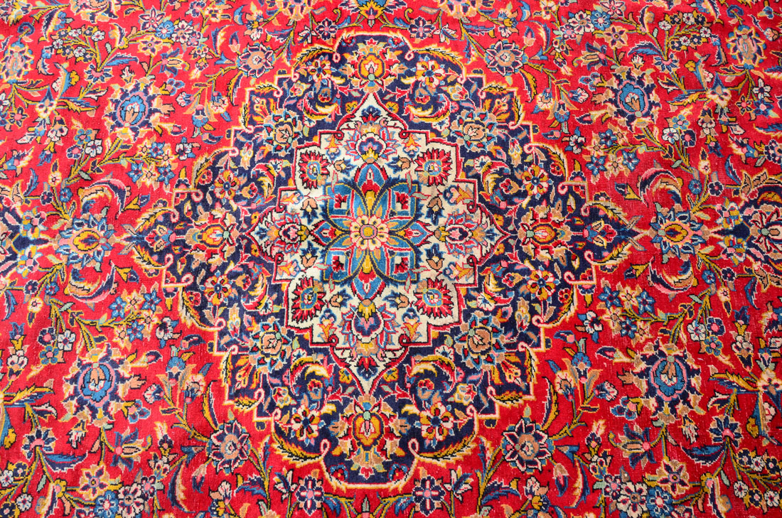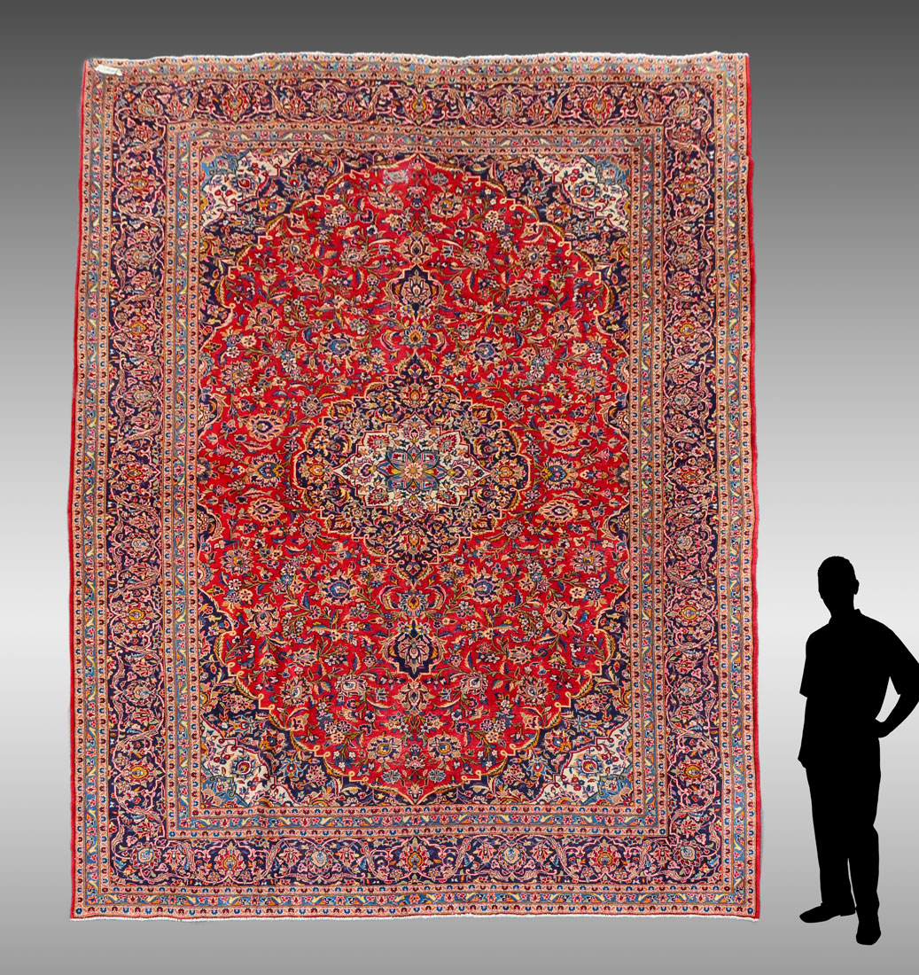 APPROX 20-40 YR OLD INDO-KASHAN HAND KNOTTED WOOL RUG, 9'10'' X 13'5'': This rug has a very detailed Classic Persian design. In the red ground is a blue central medallion with spandrels and blue and white corners. The corners and the medallion are outlined in a strong yellow and red. The yellow color is also present in many of the flowers, leaves, and palmettes that cover the field. There are multiple guard borders and a wide main border.