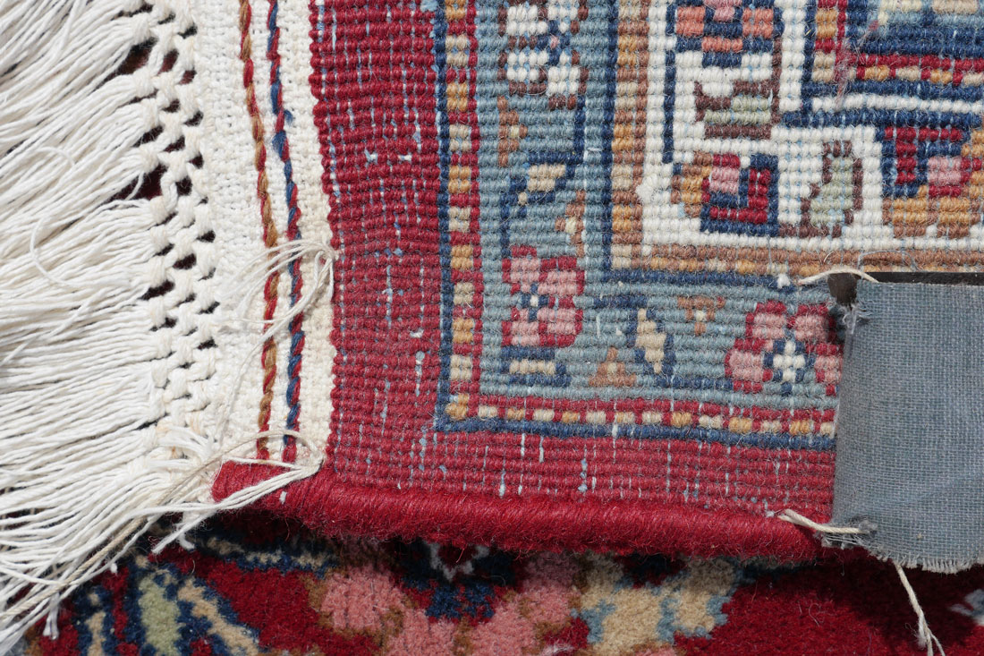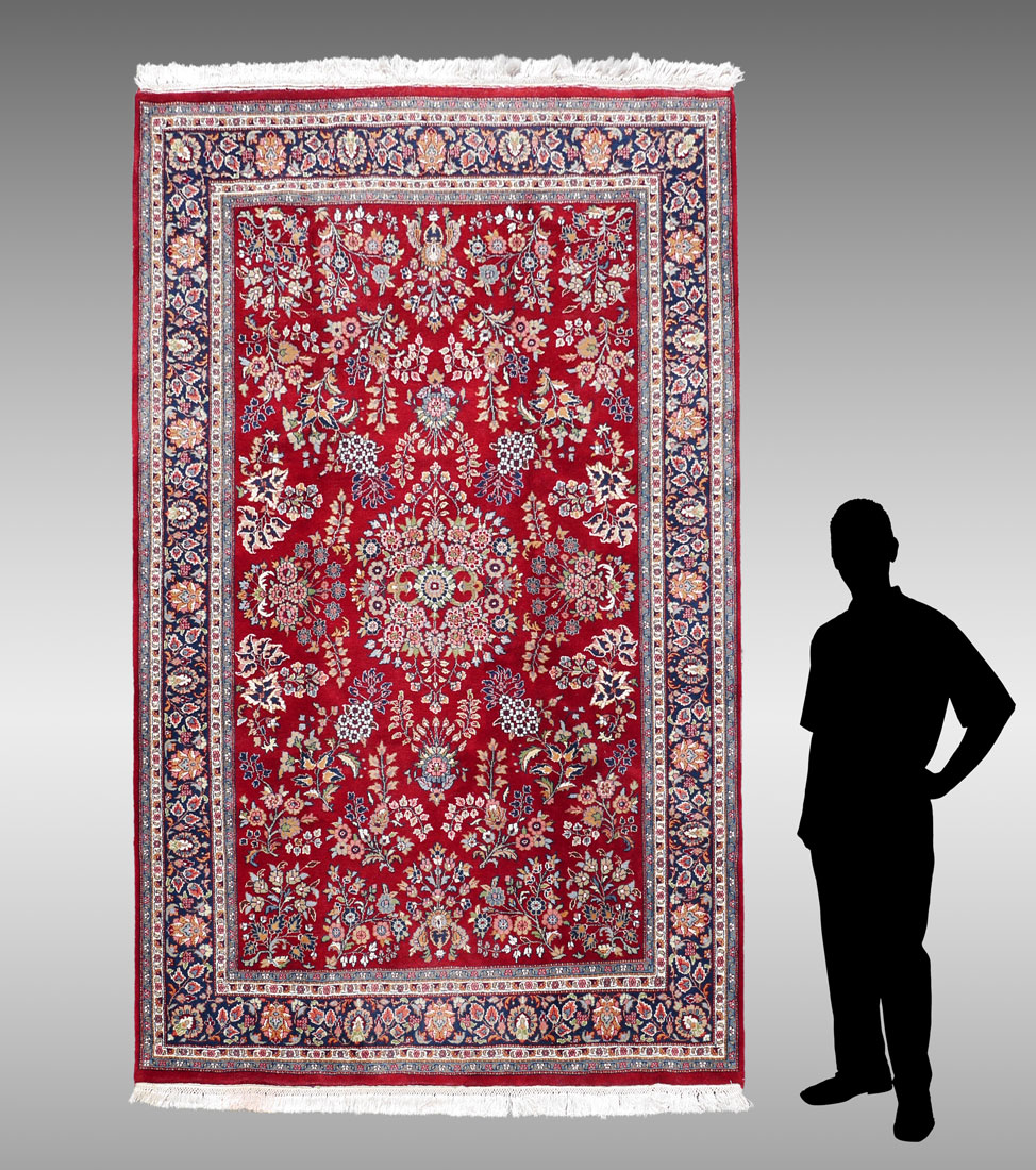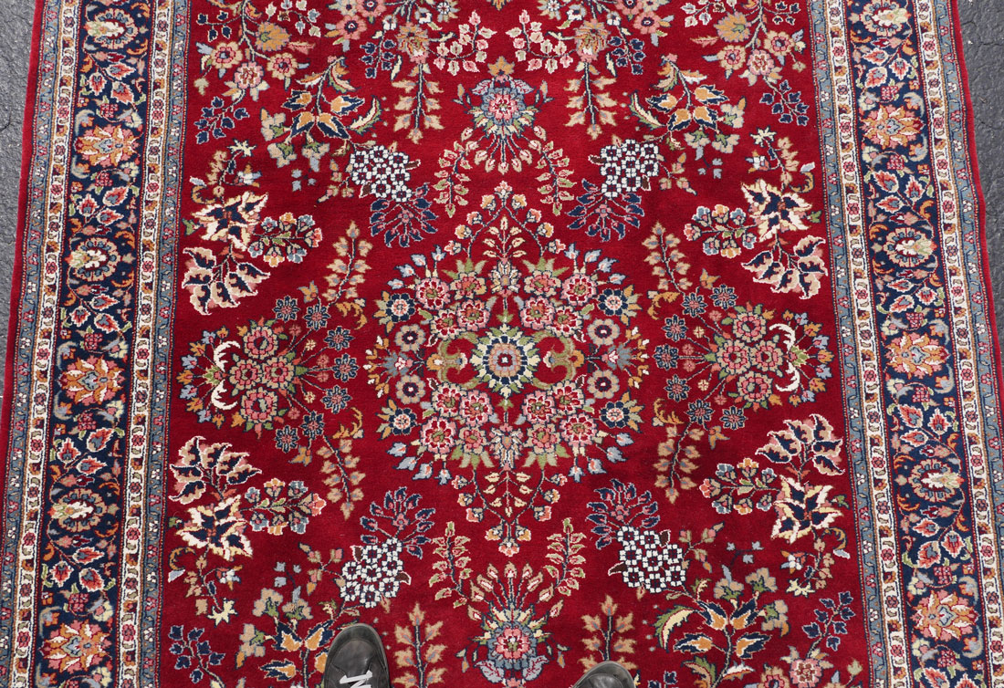 APPROX 20-40 YR OLD INDO-PERSIAN SAROUK PATTERN HAND KNOTTED WOOL RUG, 6'1'' X 9'3'': This well-made rug has a traditional Sarouk design consisting of clusters or sprays of various flowers placed all over the red main field of the rug. A larger cluster makes up the central medallion with mostly smaller sprays around it.