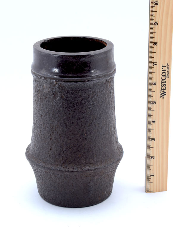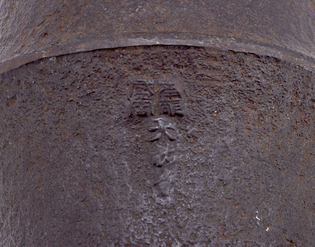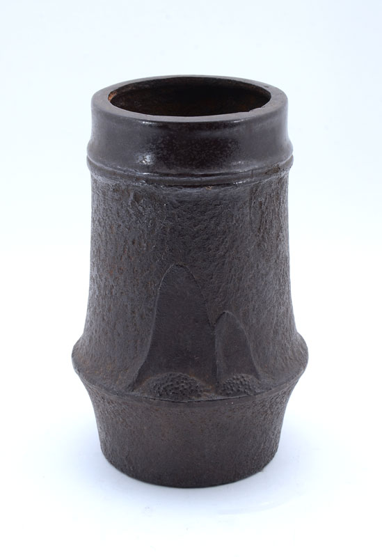 SIGNED JAPANESE CAST IRON KABIN VASE: Cylindrical cast iron vase with flared waist, 2 round mountains decoration, signed under waist, overall 8'' h. x 5 1/4''.
