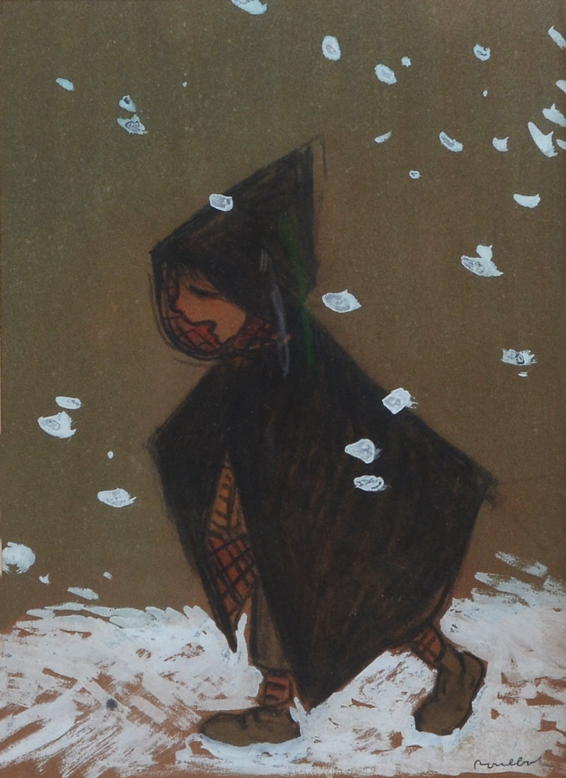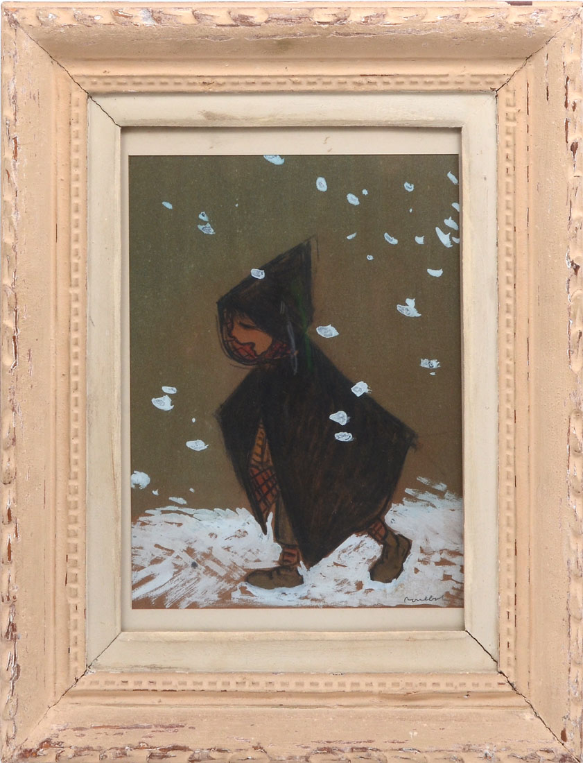 ILLEGIBLY SIGNED ILLUSTRATION OF LITTLE GIRL IN CAPE, SINGING AND WALKING IN THE SNOW: Colored Drawing heightened with white, sight size 11'' x 8.5'', painted frame, 18.5'' x 14.5''. Provenance: Estate of Yves Georges Prade