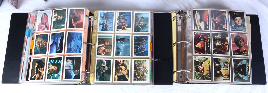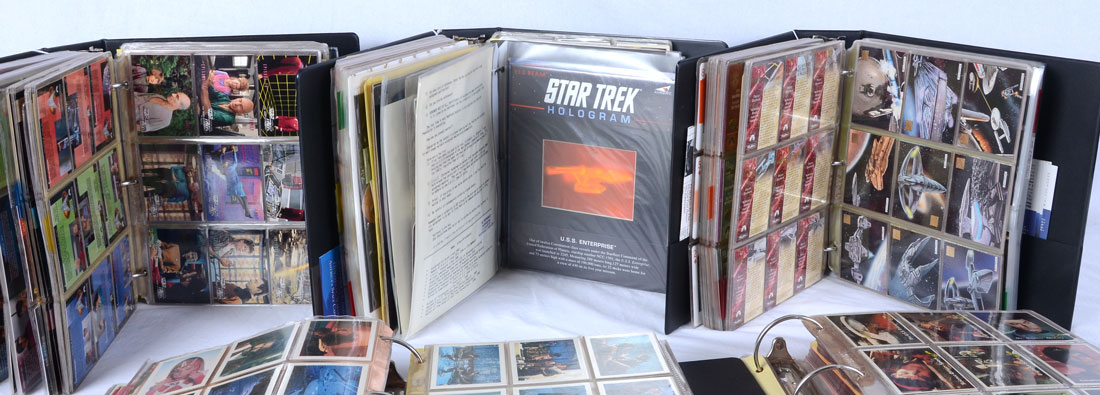 INCREDIBLE COLLECTION OF STAR TREK TRADING CARDS: 5 binders filled with vintage star trek trading cards ranging from the original series (TOS) to Next Generation, Voyager and movies. Some highlights to include 1975 Morris National stickers, 1976 Topps 88 cards & 22 stickers, 400 1979 Panini cards, multiple promotional cards sets, 1981 reprints of the original 1967 Desilu cards, and many, many other complete or near completes sets. Also included is associated ephemera and convention memorabilia. A unique opportunity for the Trekker in your life.