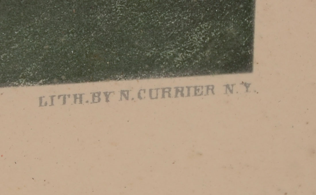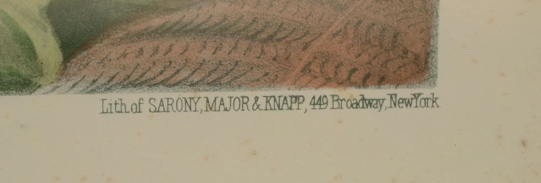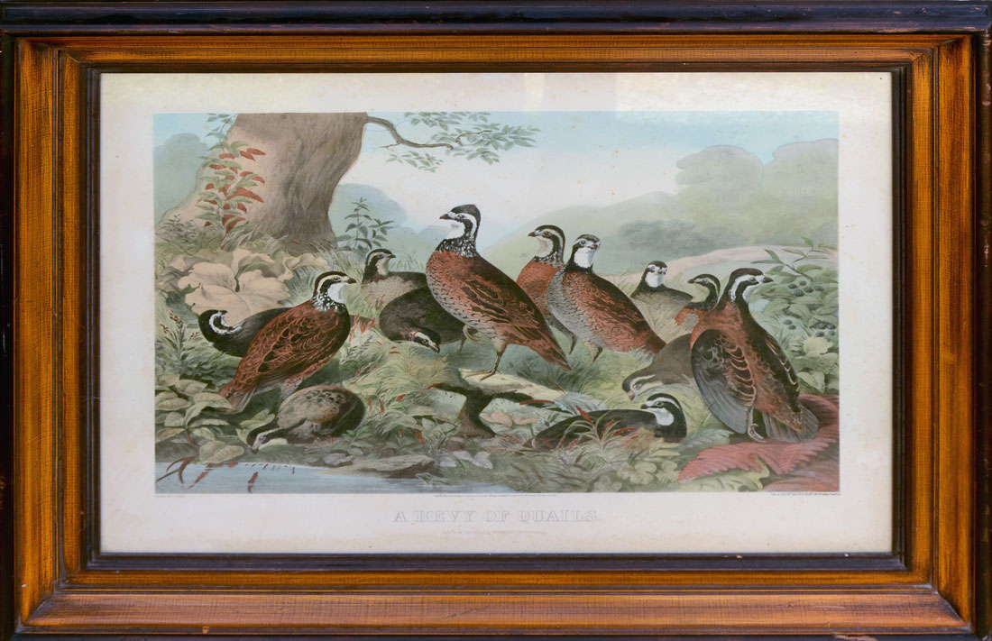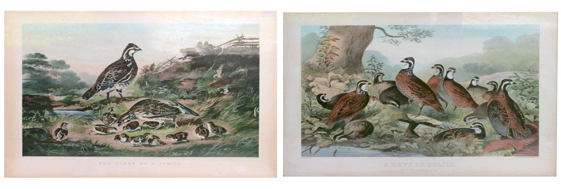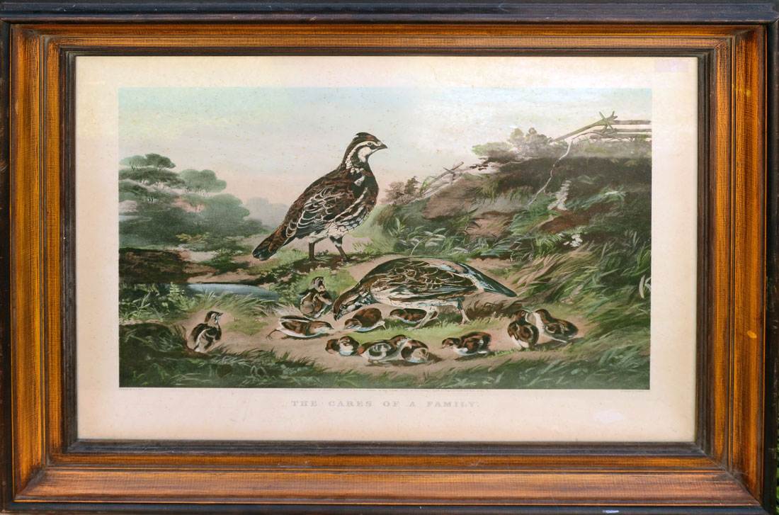 TWO EARLY QUAIL LITHOGRAPHS: 1) ''The Cares of a Family'', Lithograph by Currier, sight size 23'' x 27.5'', framed, 30.5'' x 34'', scattered staining and foxing throughout; 2) ''A Bevy of Quails'' by Sarony, Major and Knapp, sight size 23.5'' x 27.5'', framed, 30.5'' x 34.5''.