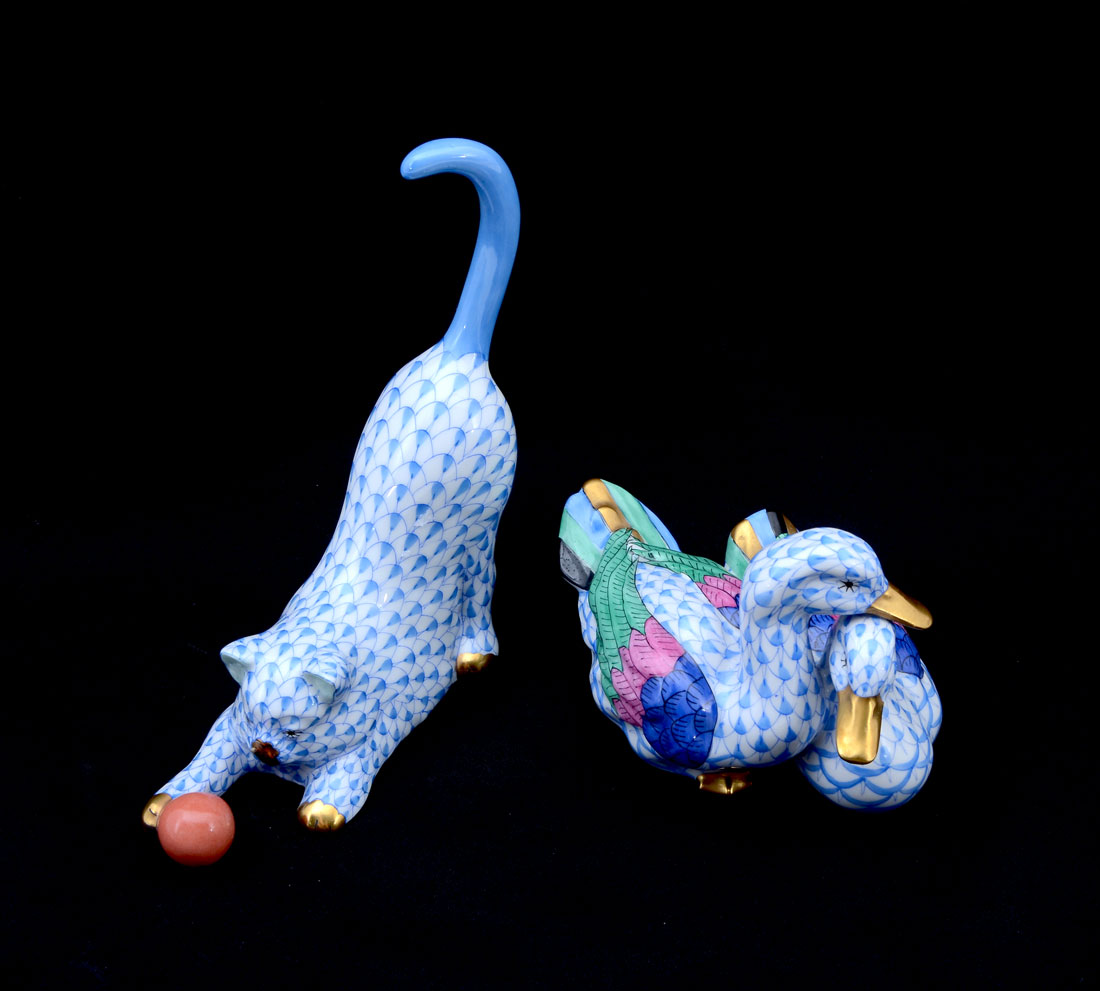 HEREND FISHNET CAT AND DUCKS FIGURINES: 2 pieces total to include 1) Blue fishnet cat with orange ball, 5 1/4'' h. x 5''. 2) 2 blue fishnet and polychrome ducks, 2 3/4'' h. x 4 1/2''.