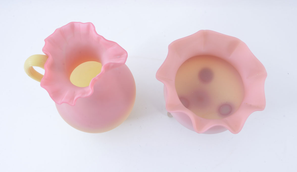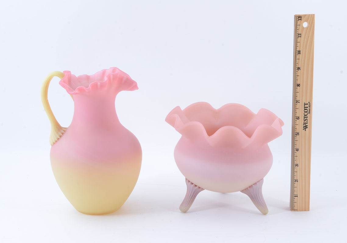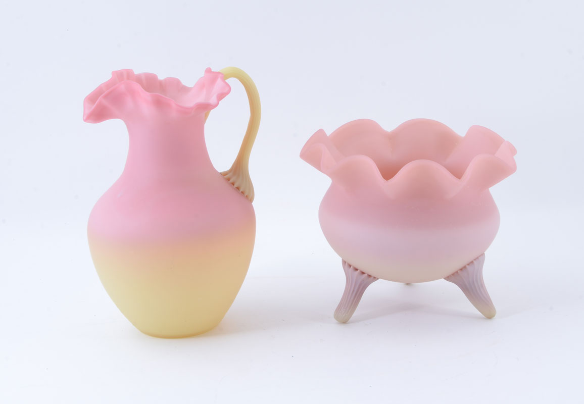 2 PIECE PEACHBLOW SATIN GLASS PITCHER AND BOWL: 2 piece total, unmarked , to include 1) Pitcher with ruffled rim, ribbed handle, 8 3/4'' h. x 5 1/2''. 2) Footed bowl with ruffled rim, 6 1/4'' h. x 7 1/2''.