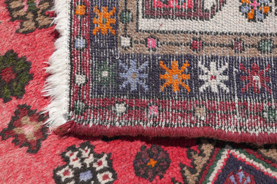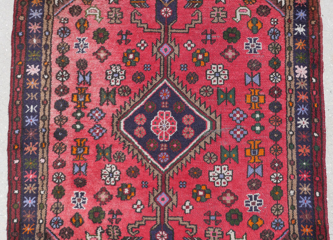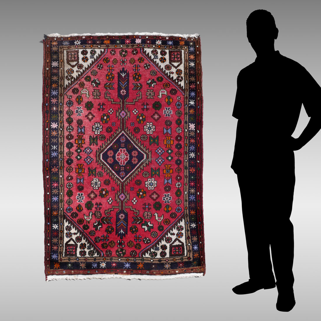 APPROX 35-50 YR OLD PERSIAN DERGAZINE HAND KNOTTED WOOL RUG, 3'4'' X 4'7'': This rug has a small blue medallion with elongated spandrels on either end on a red field. The rest of the field has small motifs mostly flower heads, but also some birds. In the four white corners, there are four little houses! Neato.