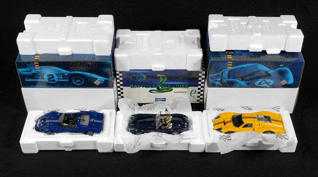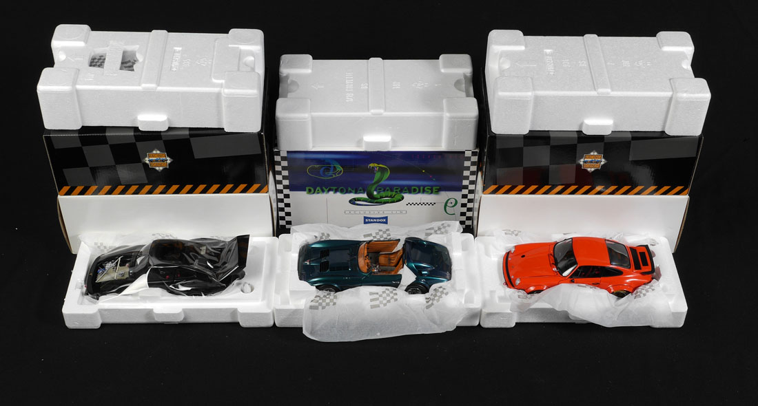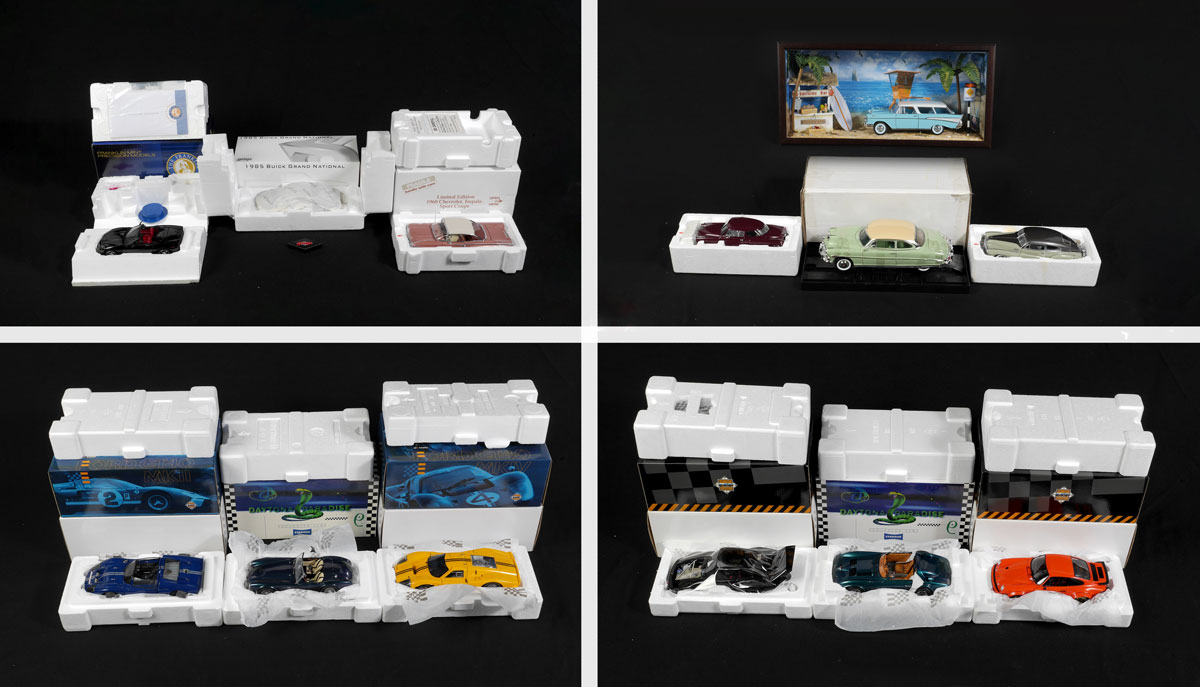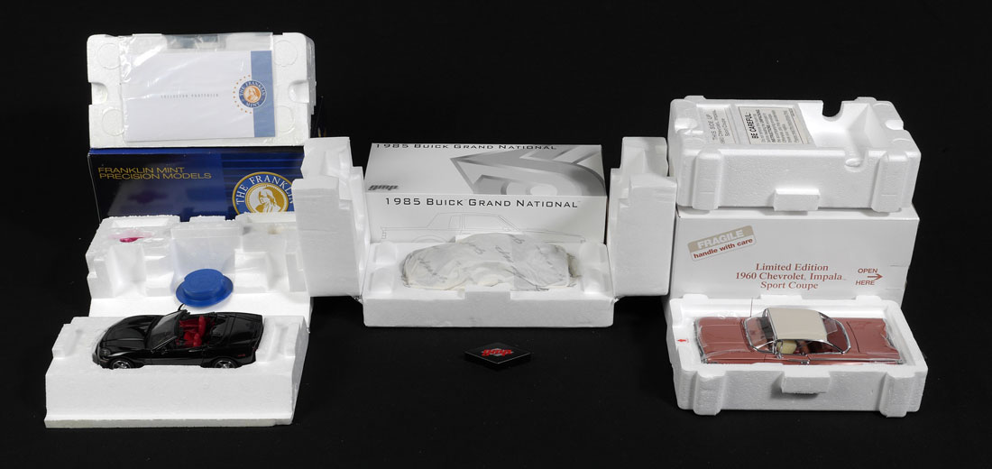 COLLECTION OF 13 ASSORTED MODEL CARS & MORE: An assembled collection of approx. 13 cars, to include Danbury Mint 1) 1960 Chevy Impala Sport Coupe with box. 2) 1951 Studebaker, no box. 3) 1948 Buick Roadmaster, no box. 4) Hudson affixed to base. 5) 1957 Chevy Nomad Surf's Up in shadowbox frame, no box. Racing Legends to include 6) Porsche 934RSR in box. 7) Porsche 935 with box. 8-9) 2 Ford GT40 with boxes. 10) Corvette in wrong box. 11) Franklin Mint 2005 Corvette in box. 12) Standox Corvette Grand Sport 13) GMP 1985 Buick Grand National. Sold with 3 plastic display cases and bases in boxes.