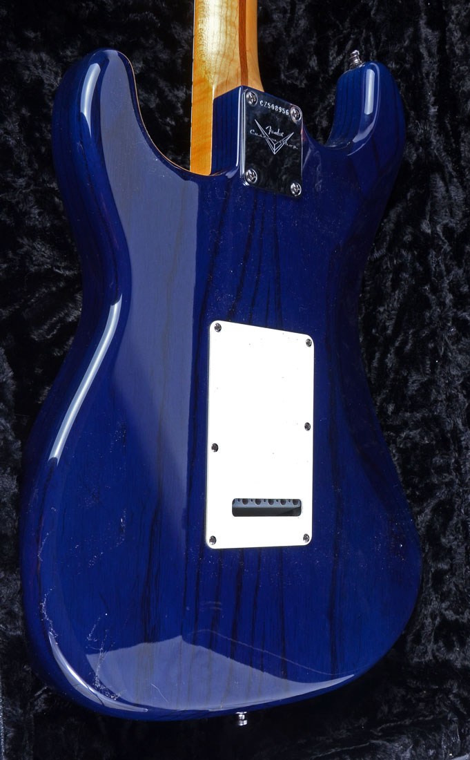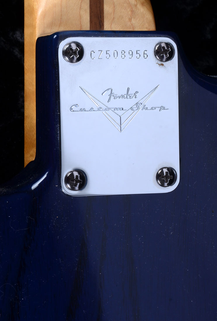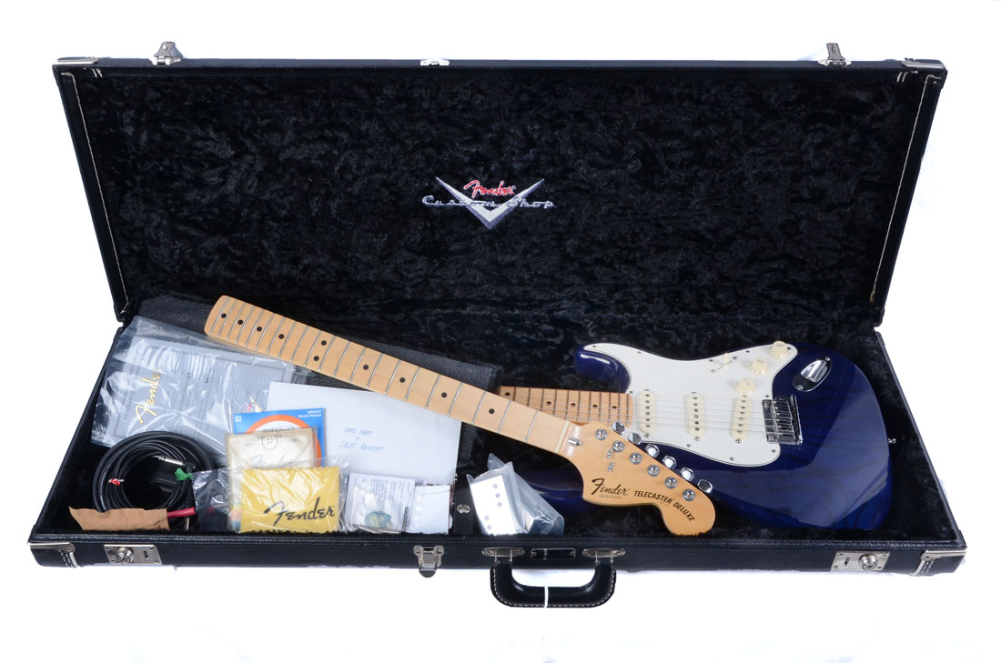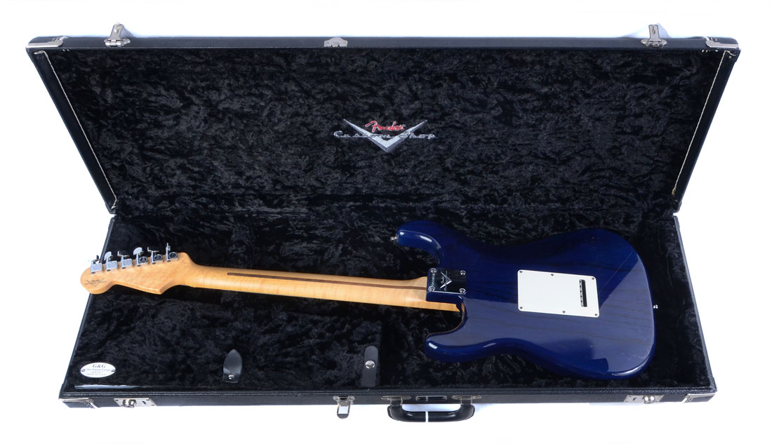COBALT BLUE FENDER STRATOCASTER GUITAR & CASE: Cobalt blue ash wood body and maple neck with Fender ''custom shop'' hard body travel case and original certificate of authenticity. Case filled with all of your guitar needs! To include: wammy bar, picks, two sets of strings, a strap, strap locks, two cords, extra springs, an allen wrench and cleaning cloth.