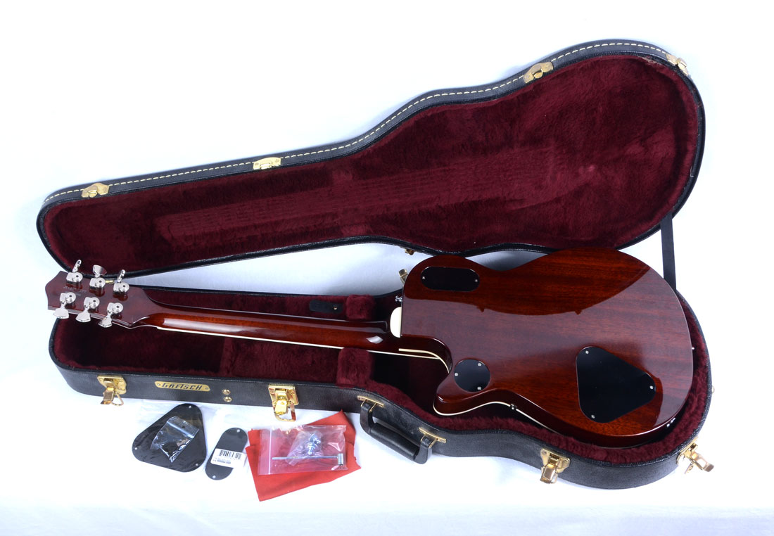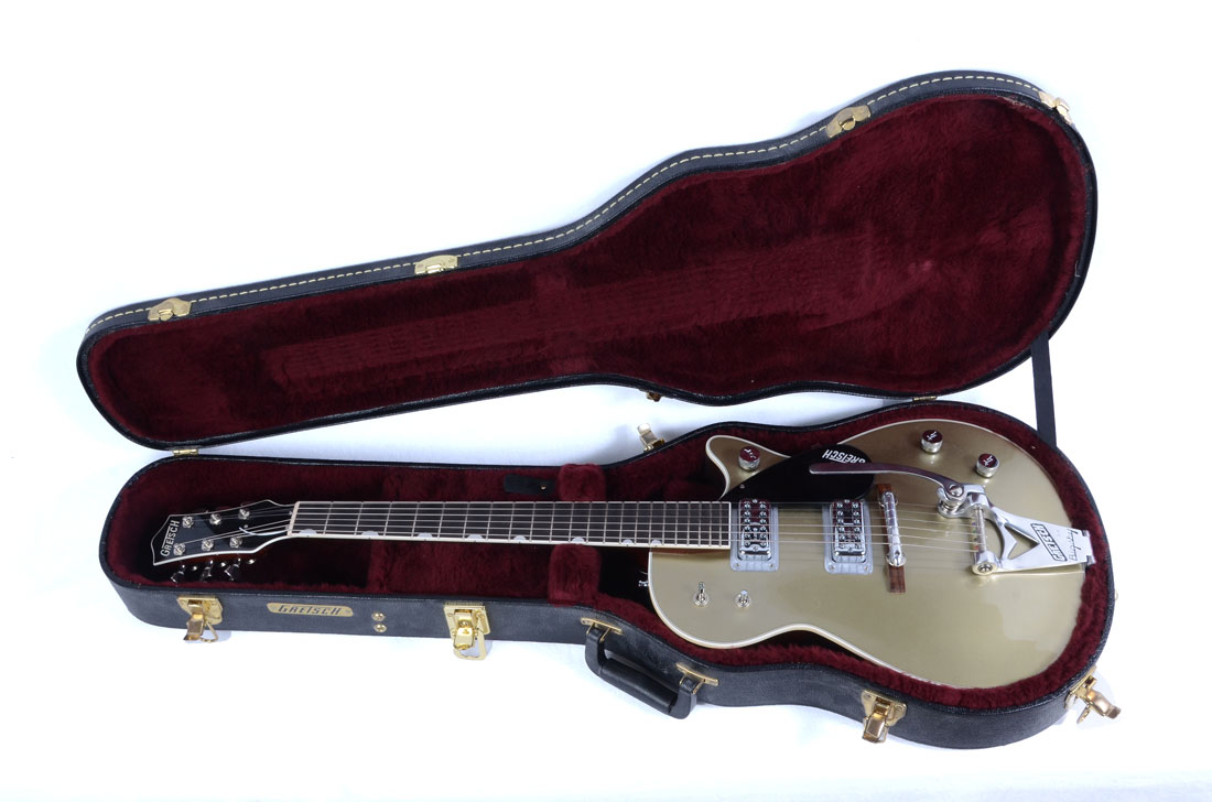 METALLIC GOLD GRETSCH GUITAR AND CASE: This guitar has six channels and a built in wammy bar, sold with a locking hard travel case with key. The case contains two spare back plates, strap locks, a wrench and cleaning cloth.