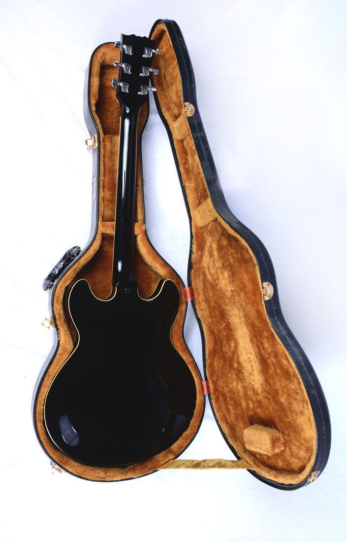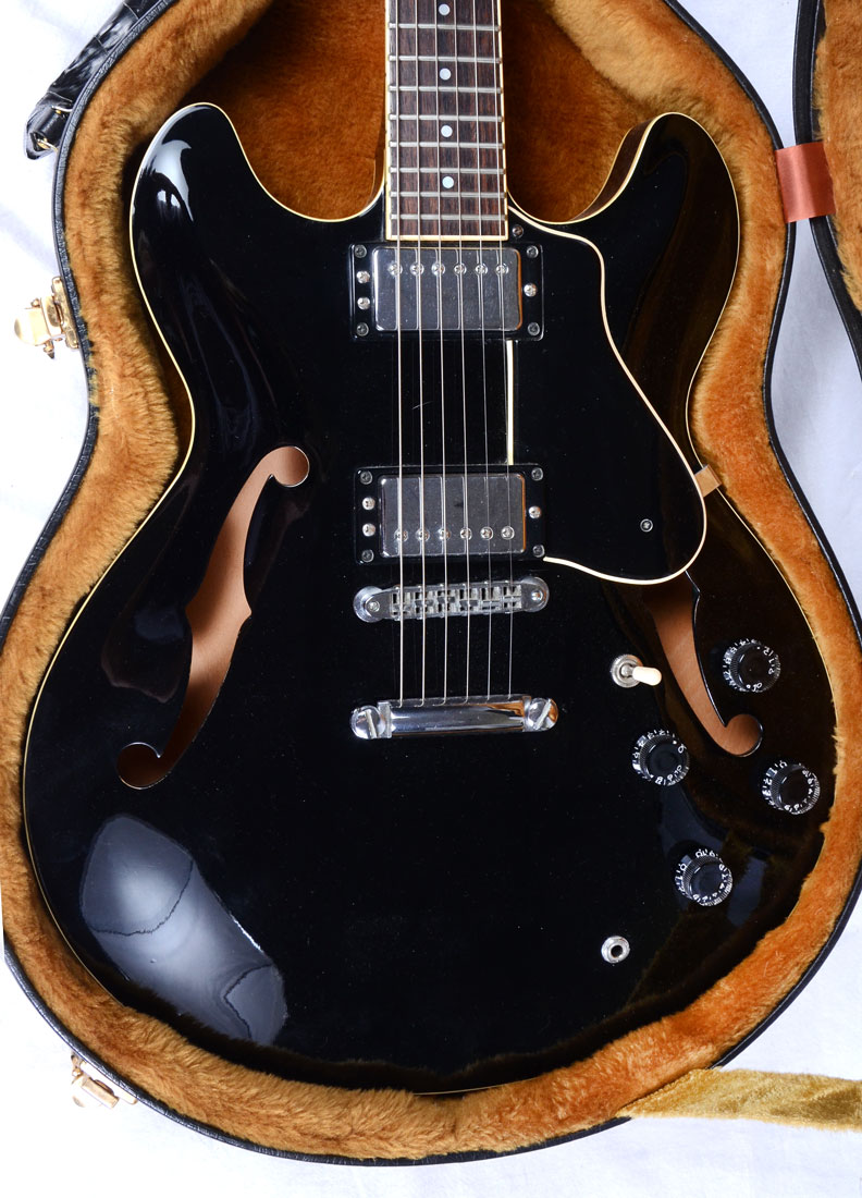 YAMAHA SA 800 HOLLOW BODY GUITAR AND CASE: Black with ivory colored trim hollow bodied guitar with a three-channel switch. Has its own hard travelling case that contains two sets of strings and a pair of strap buttons.