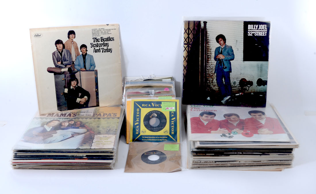 COLLECTION OF VINTAGE VINYL RECORDS: Approx. 43 long play full albums, artist to include The Beatles ''Yesterday And Today''; Elvis Presley; Billy Joel; Peter, Paul, and Mary; Kenny Rogers and more. Sold with sixteen 45 singles.