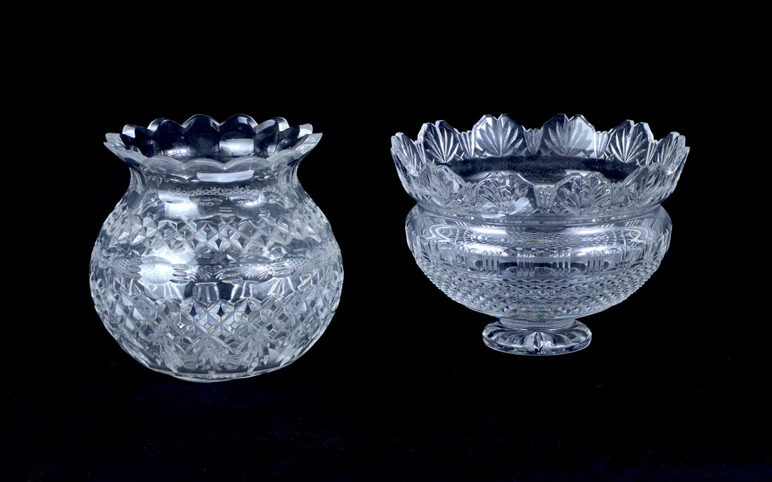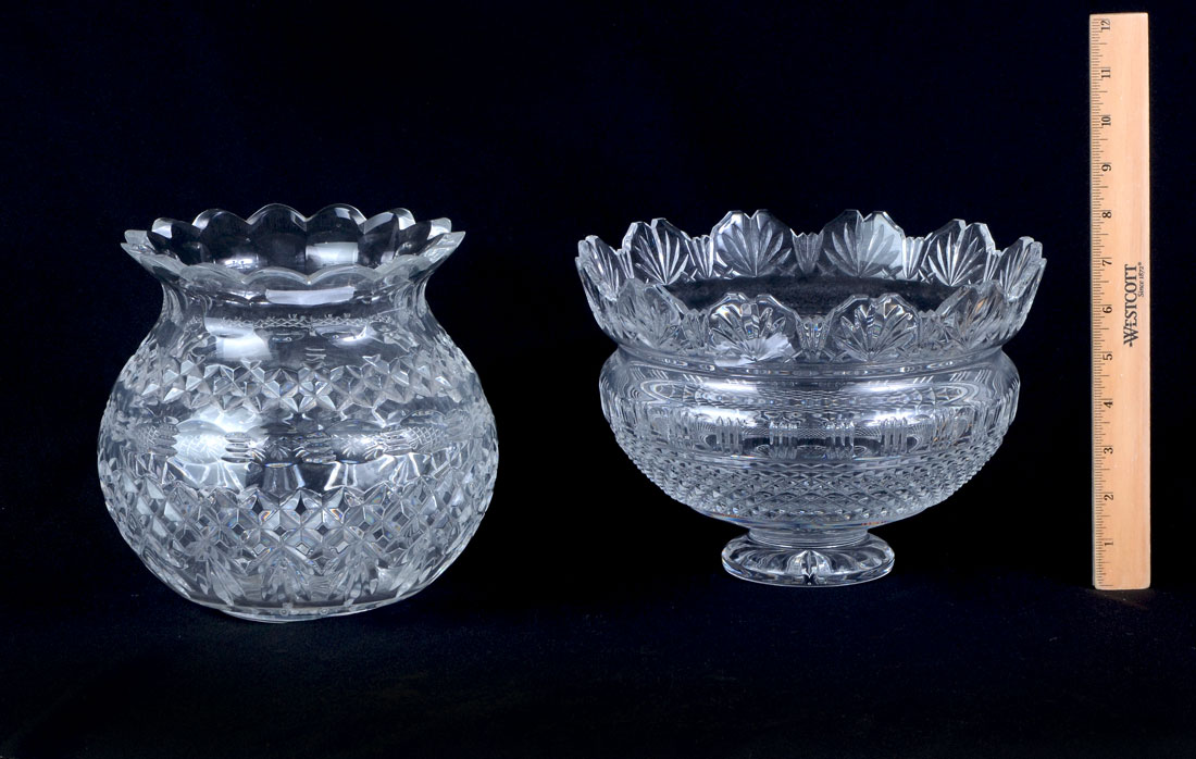 2 WATERFORD CRYSTAL BOWLS: Both signed Waterford to include 1) Monteith fruit bowl 7'' h. x 10 1/4''. 2) Bulbous body bowl with scalloped flared rim, 8'' h. x 8''.