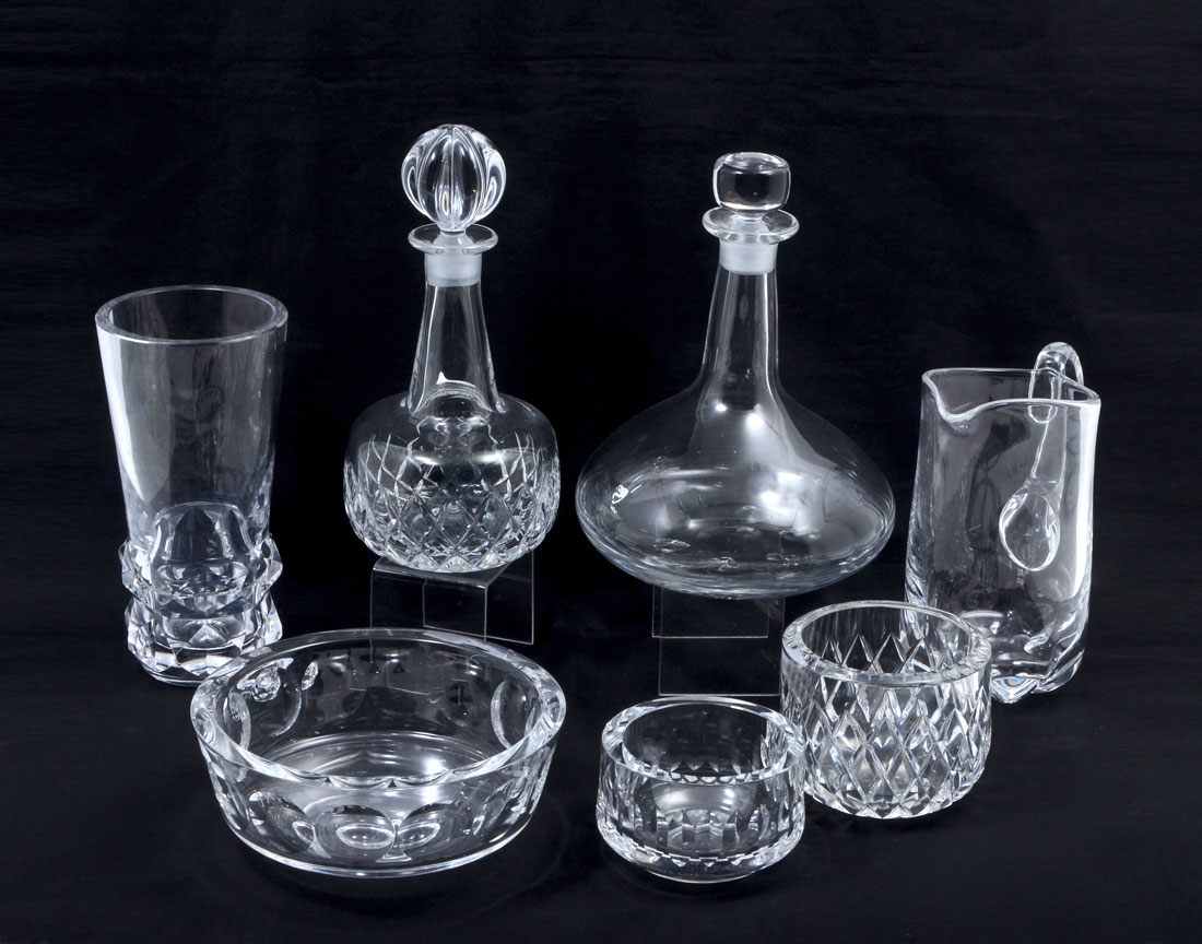 7 PIECE COLLECTION OF ORREFORS CRYSTAL: An assembled collection of 7 pieces total, each marked Orrefors, to include 1) Water pitcher, 8 1/4'' h. 2) Ships decanter with stopper, 10 1/4'' h. 3) cut decanter with stopper, 11'' h. 4) Small cut bowl, 4 3/4'' dia. 5) Larger cut bowl, 4 3/4'' dia. 6) Largest cut bowl, 8'' dia. 7) Tall vase, 9 1/4'' h.