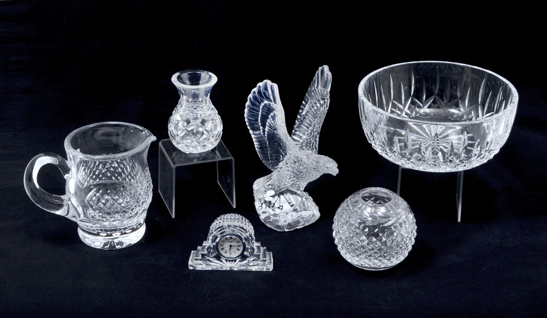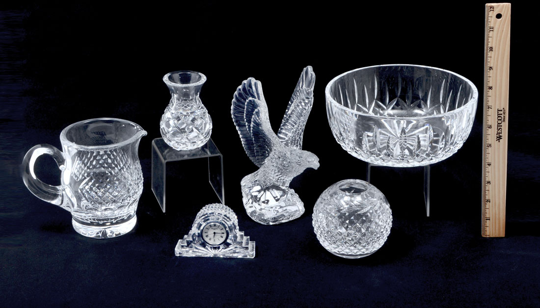 6 PIECE COLLECTION OF WATERFORD CRYSTAL: An assembled collection of 6 pieces total to include 1) Lismore fruit bowl, 8'' dia. 2) Pitcher, 5 1/4'' h. 3) Globe bowl 3 3/4'' dia. 4) Small vase 4'' h. 5) Eagle figure, 8'' h. 6) Desk clock, 2 1/2'' h.