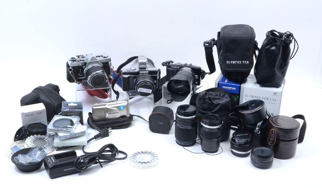 COLLECTION OF OLYMPUS CAMERAS & LENSES: An assembled collection to include 1) Olympus OM-1 body, G. Zuiko 1:1.4, f=50mm lens. With neck strap. 2) Pen Lite E-PL5 digital body, G. Vario 1:3.5-5.6/14-45 Mega O.I.S lens. With neck strap. 3) Pen E-PL1 digital body, VF-3 viewfinder, Olympus digital 14-42mm 1:3.5-5.6 LED lens. With neck strap. 4) Olympic StylusEpic Zoom 80 digital camera. 5) Vivitar Automatic Tele Converter 2X-21. 6) Zuiko Auto-Zoom 35-105mm, 1:3.5-4.5 lens. 7) E. Zuiko Auto-T 1''3.5, f=135mm lens. 8) G. Zuiko Auto-W, 1:2.8, f=35mm lens. Sold with an assortment of accessories.