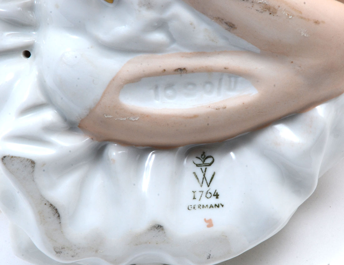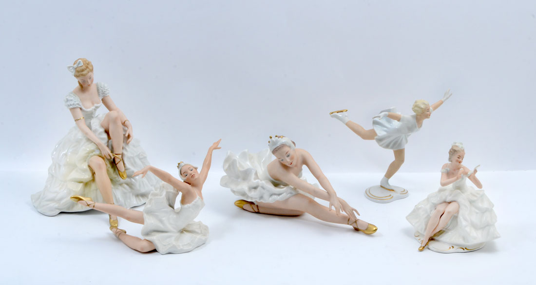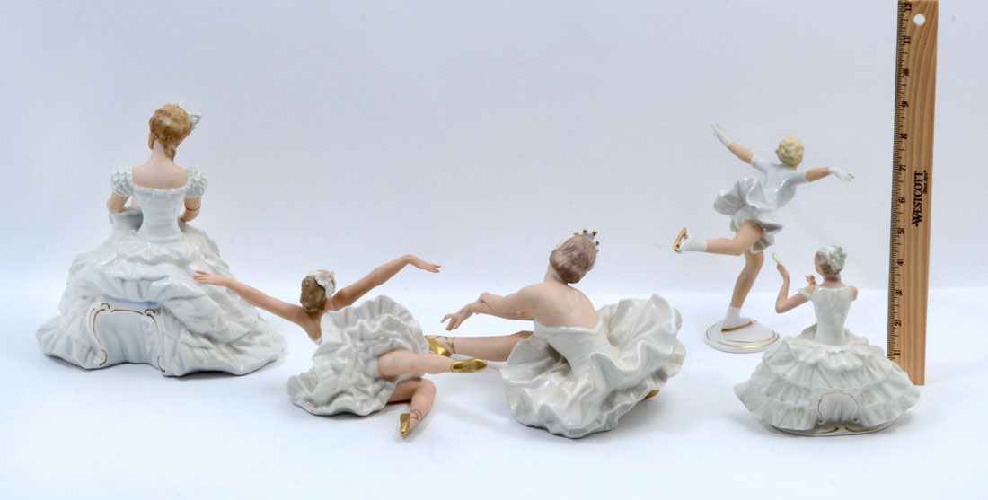 5 GERMAN PORCELAIN BALLERINA & OTHER FIGURINES: An assembled collection of 5 pieces total to include 1) Wallendorf seated ballerina tying her slippers, 8'' h. x 8'' x 7''. 2) Wallendorf ballerina on side with hands up, 5'' h. x 9 1/2''. 3) Wallendorf seated ballerina stretching 5'' h. x 10''. 4) Schaubach Kunst ice skater, 6 1/2'' h. x 7''. 5) Seated woman applying makeup, unknown impressed mark, 5 1/2'' h. x 5 3/4''.