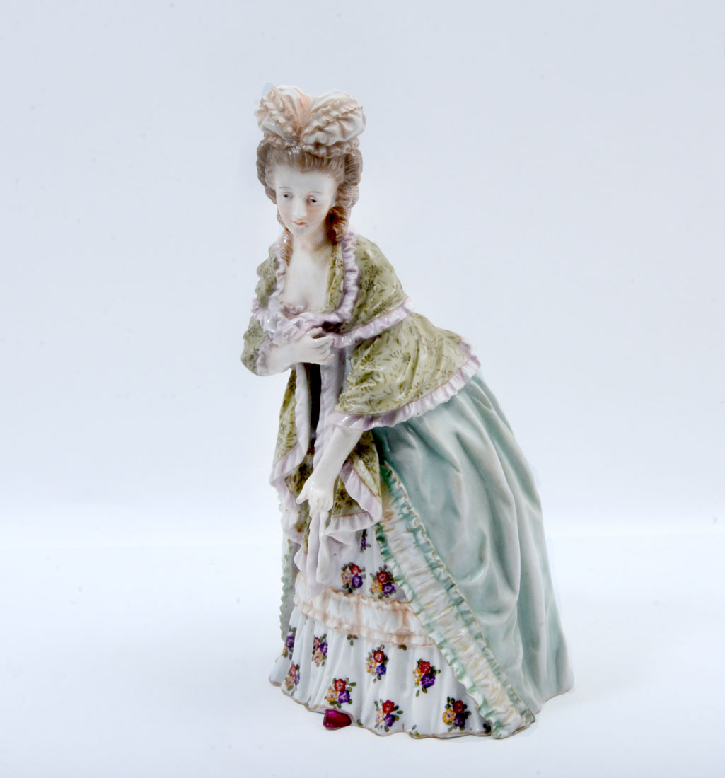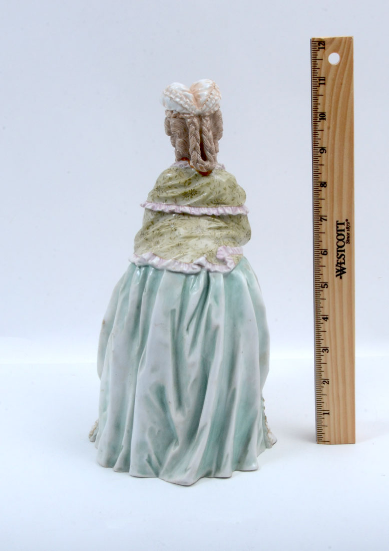 GERMAN PORCELAIN FIGURE OF A LADY: Most likely Ernst Bohne Sons figure of a woman dressed in her finest, base with metal removable lid, blue crown over N mark. Overall 10 3/4'' h. x 6''.