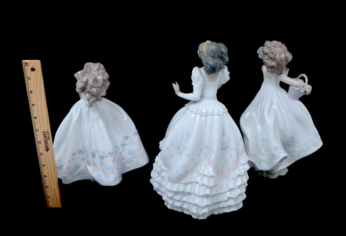 3 WOMEN LLADRO PORCELAIN FIGURINES: 3 pieces total to include 1) Quinceanera, issued 2000, retired 2004, 12 1/2'' h. 2) Wildflowers, issued 1999, 10 1/4'' h. 3) Floral Path, issued 1999, retired 2007, 11'' h. No boxes.