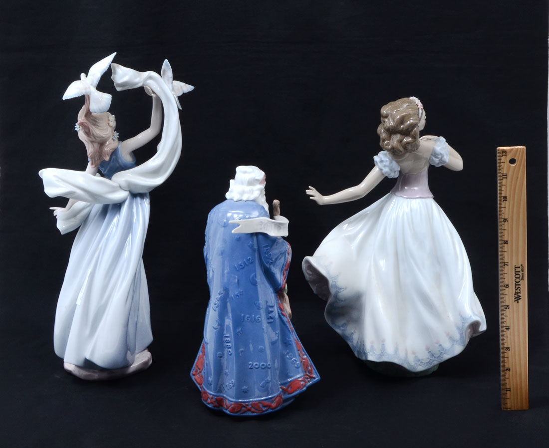 3 LLADRO PORCELAIN FIGURINES: 3 pieces total to include 1) Sweet Sixteen, issued 2000, retired 2004, 13'' h. 2) New Horizons, issued 1999, retired 2000, 14 1/2'' h. 3) Father Time, issued and retired 2000, 15'' h. No boxes.