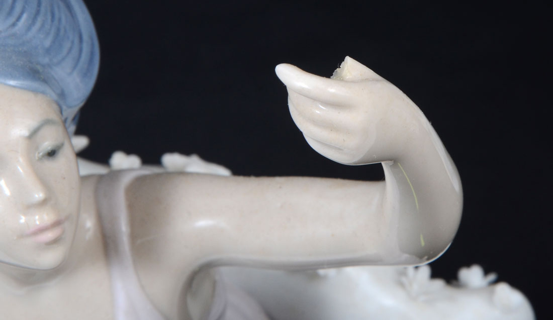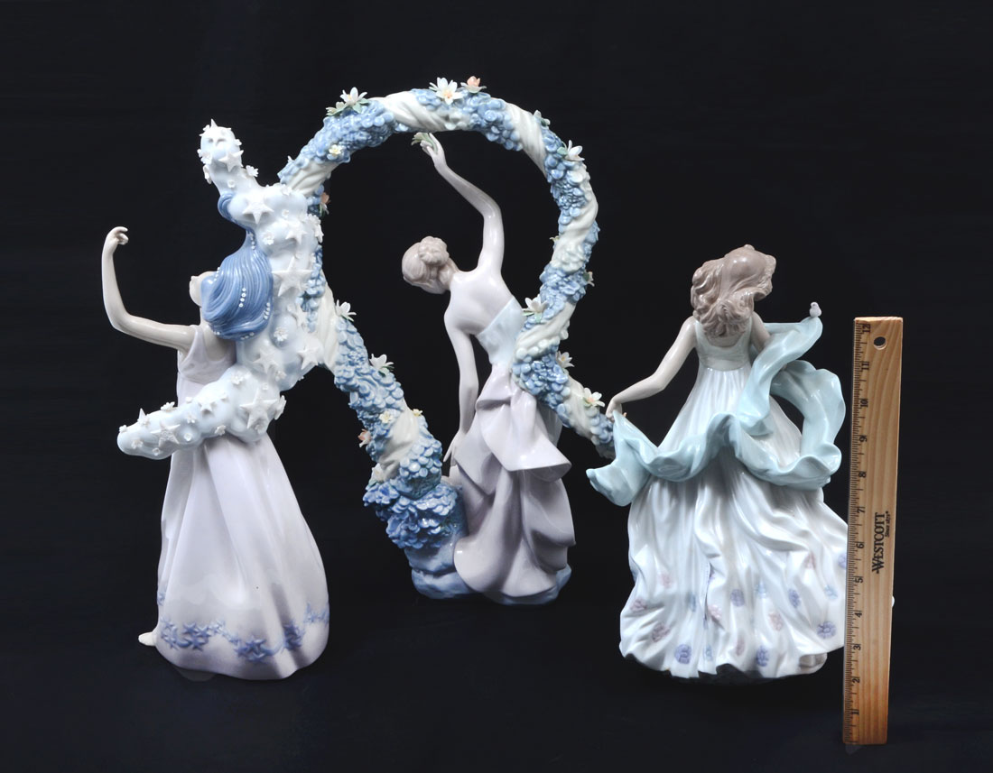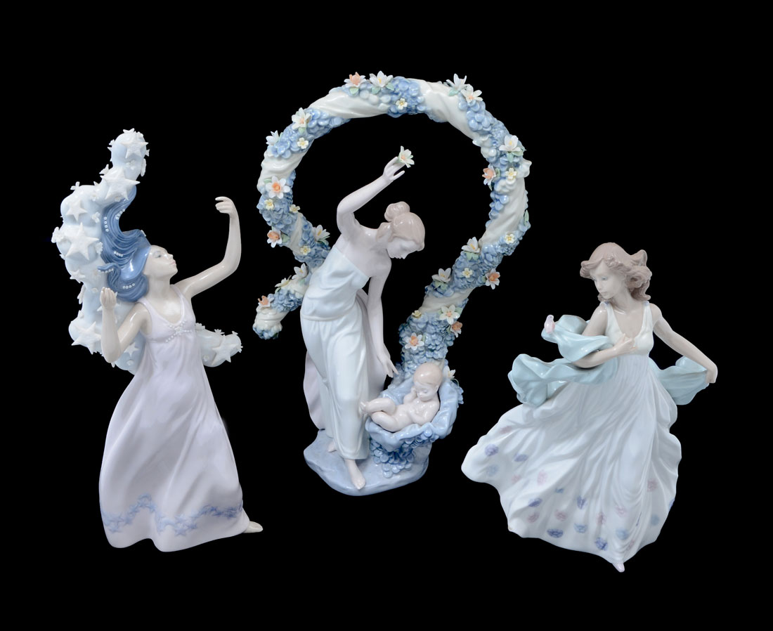 3 LLADRO PORCELAIN FIGURINES: 3 pieces total, each with condition issues, to include 1) Summer Serenade, issued 1995, retired 2004, 12 01/2'' h. 2) Rebirth, issued 1999, retired 2000, 16 1/2 h. 3) The Milky Way, issued 1998, retired 2000, 16 1/4''.