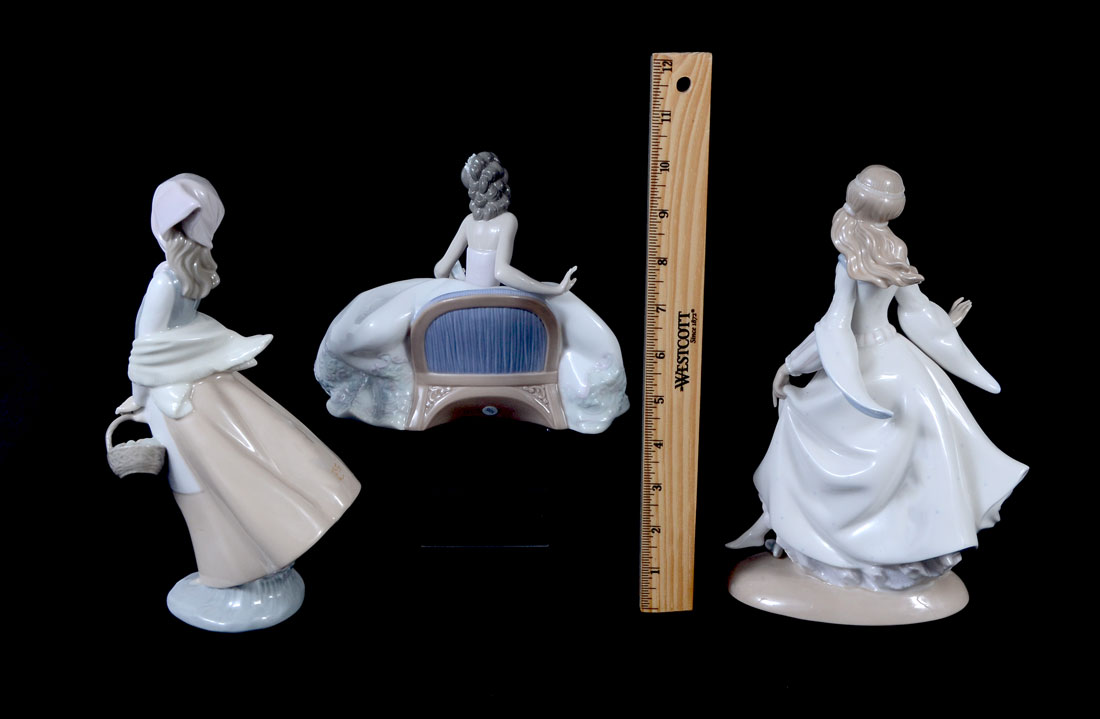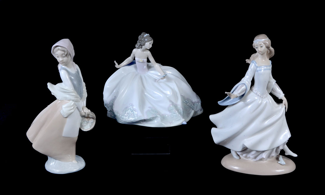 3 LLADRO AND NAO PORCELAIN FIGURINES: 3 pieces total to include 1) Lladro At the Ball, issued 1992, 6'' h. 2) Lladro Cinderella, issued 1972, retired 1978, 9 3/4'' h. 3) Nao maiden holding basket, 9 1/2'' h. No boxes.